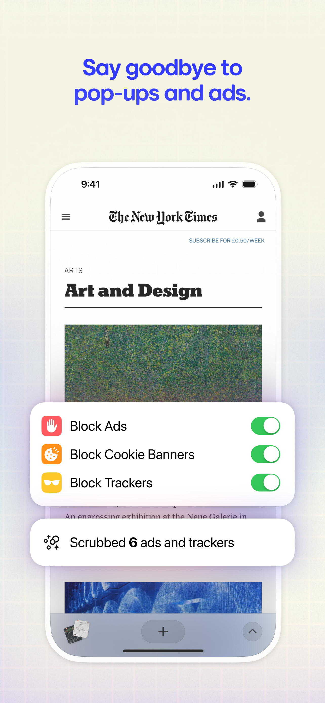 - Always-on blocking of ads, trackers, GDPR popups, and banners