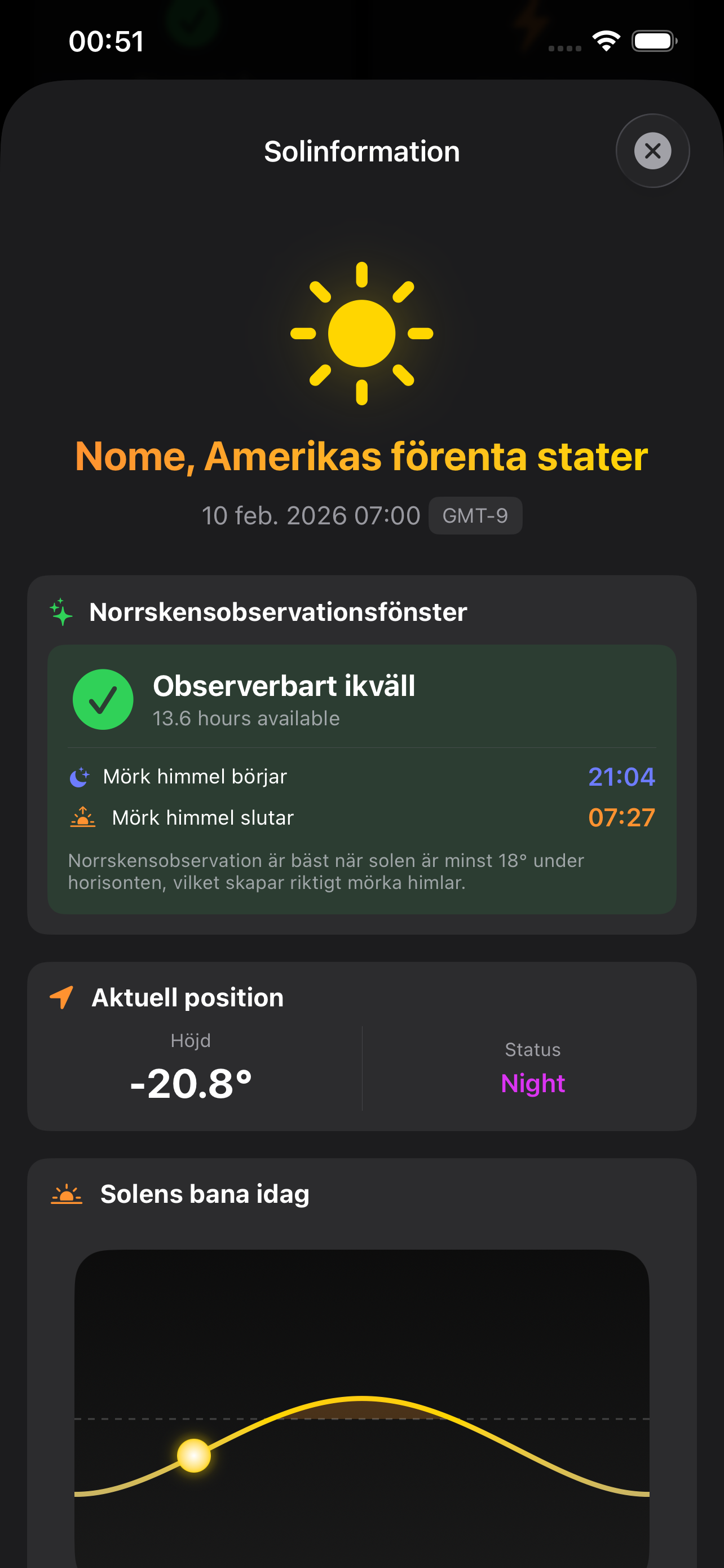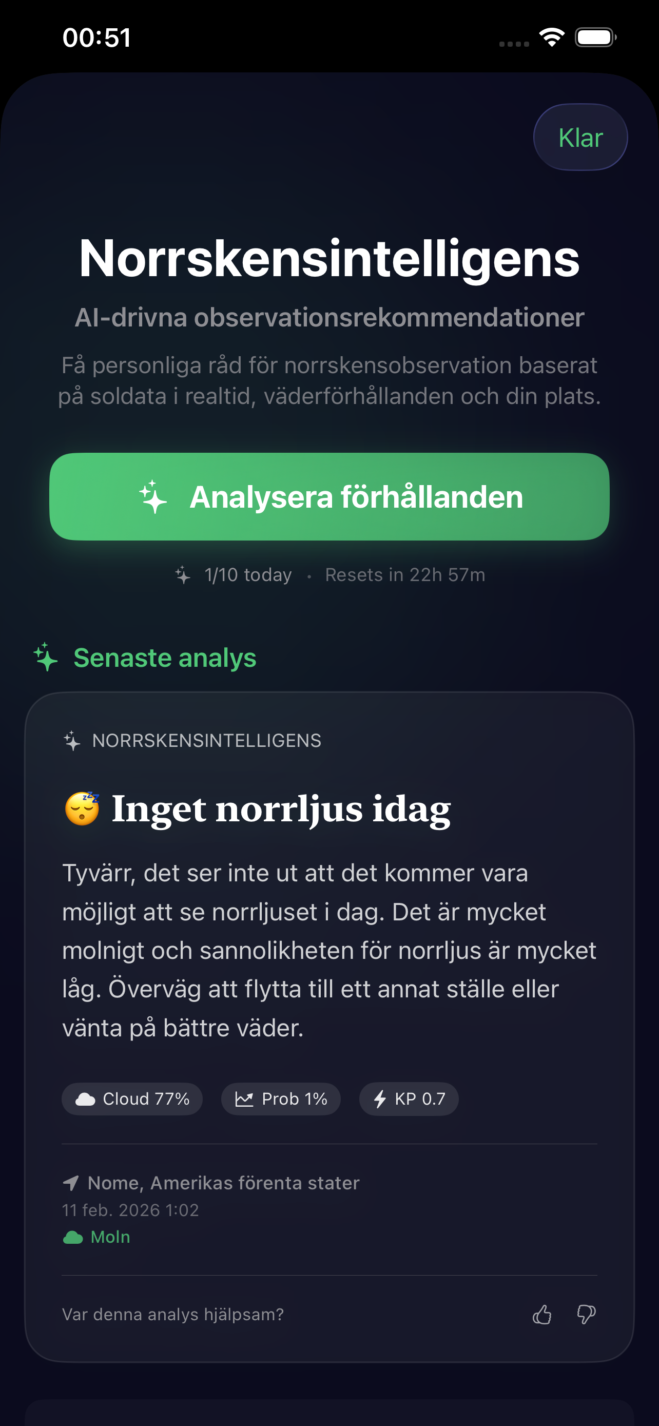 I paid for a one year subscription for alerts. But everytime I get an alert it's in the middle of the day and when I look at the nowcast it says there is a 0% chance of a northern lights visability! My guess is that they doesn't know where in the world you are and therefore giving the same alerts to all users where ever you are in the world. I feel scammed! Don't pay the extra money! Just use the free app.