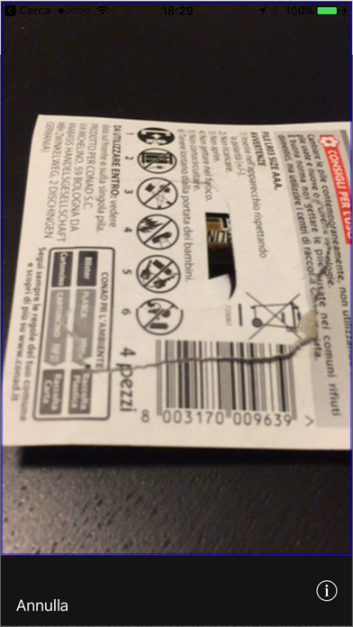 Um den Scan zu starten, tippen Sie auf die Schaltflächen "START SCAN FROM" (oder schütteln Sie das Gerät) und die Kamera startet, um einen Code zu scannen.
