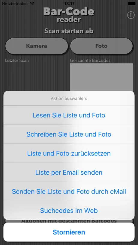 Mit den gescannten Codes können Sie sie für die spätere Verwendung speichern oder per E-Mail versenden, im Internet suchen oder in andere Apps einfügen (letzter gescannter Code wird in die Zwischenablage kopiert) oder kopieren (und fotografiert) an Ihren PC für den Einsatz in Ihren Apps mit iTunes Filesharing. Tippen Sie auf "ACTIONS WITH SCANNED BARCODES", um auszuwählen, was Sie mit den gescannten Codes tun möchten.
