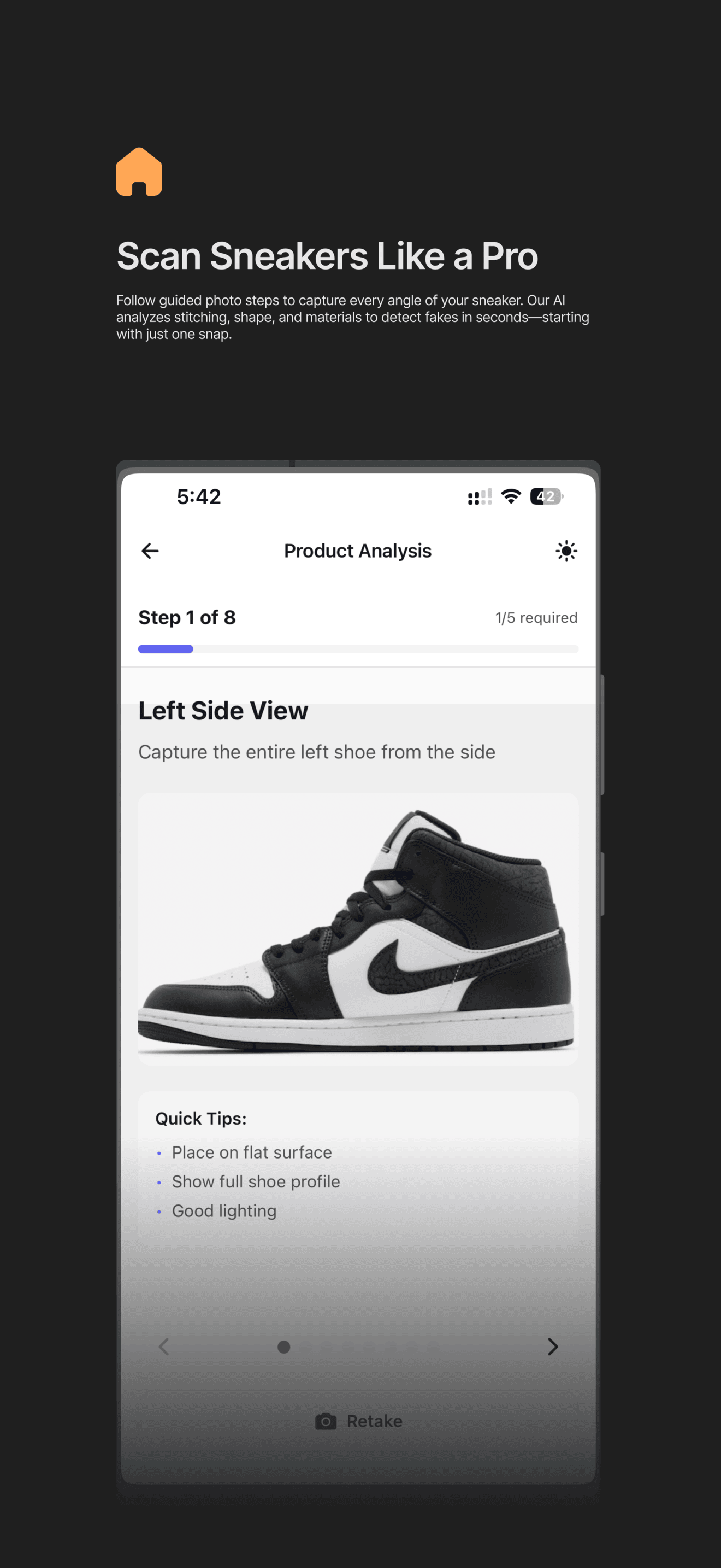 Our app guides you through the process. Take photos of the sides, soles, tags, and insoles—no guesswork.