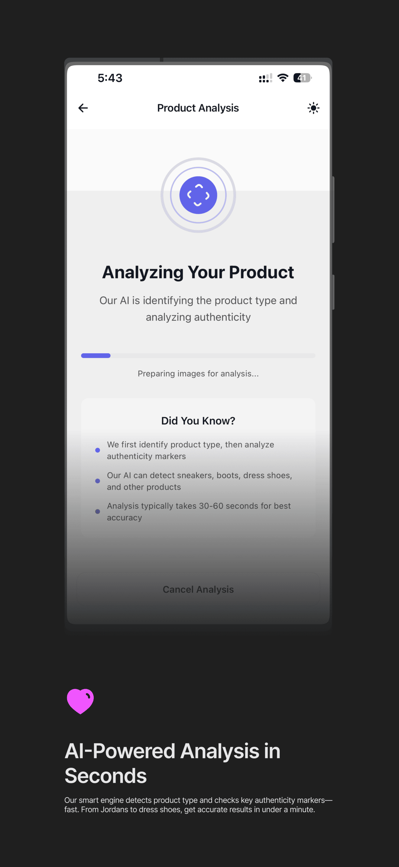 Upload photos and let our advanced system analyze materials, stitching, box labels, and more—using cutting-edge image recognition and sneaker data.