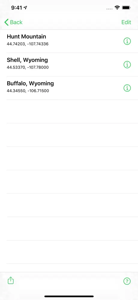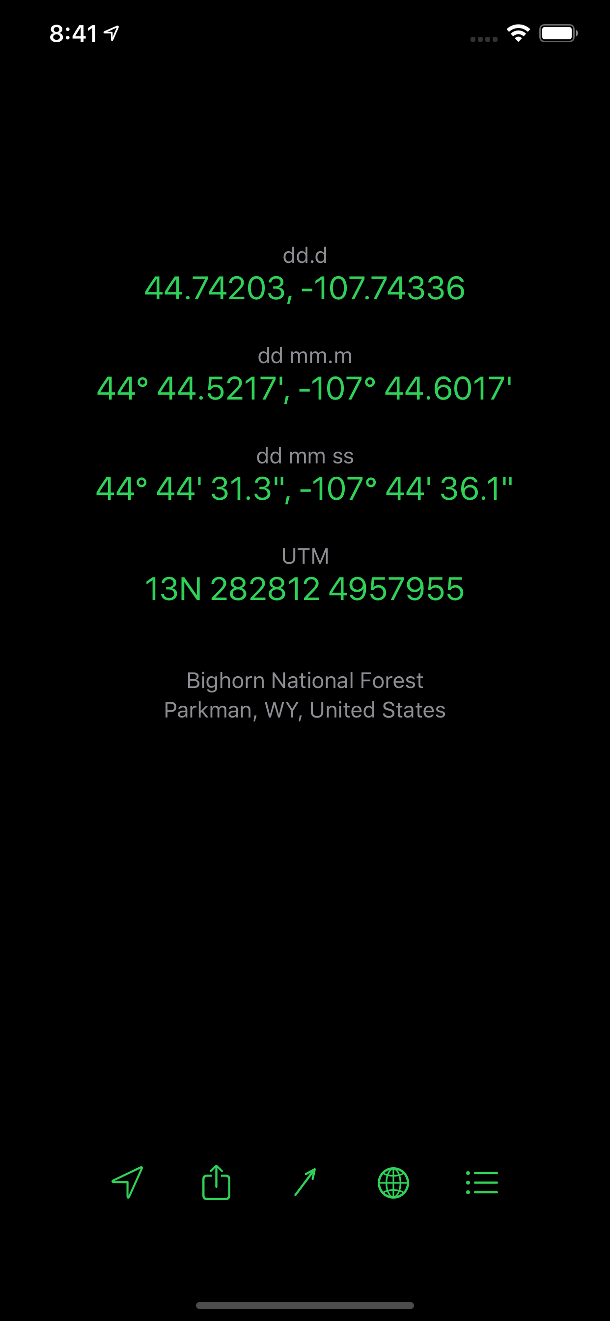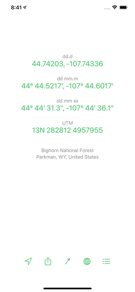 Locate yourself with GPS with a tap of a button, which also shows your current GPS precision. You can also copy or send your location, show it on a map, and get a bearing and direction to coordinates, which is great when you're hiking or boating.