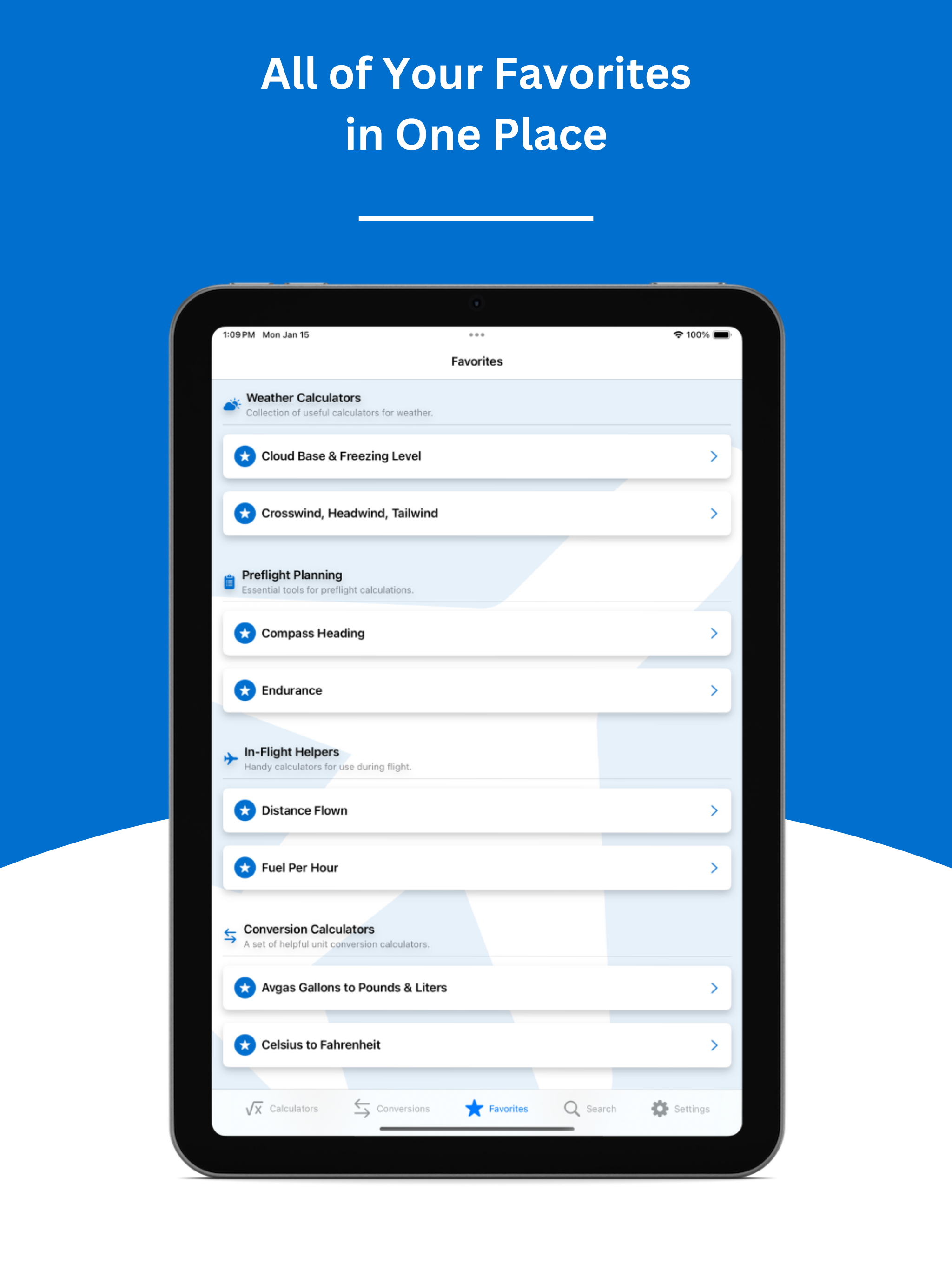 In-flight calculators to handle your altitude, speed, and distance. We've taken the guesswork out of the equation, so you can focus on the task at hand: not making clouds your unplanned landing site.