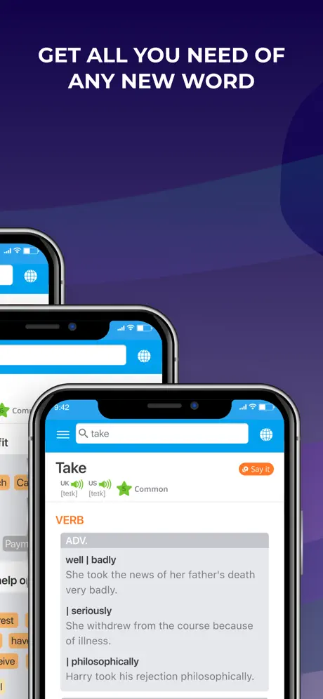 • Definition: Get the meaning or definition of a word with illustrations, phonetic transcription, and audio pronunciation.