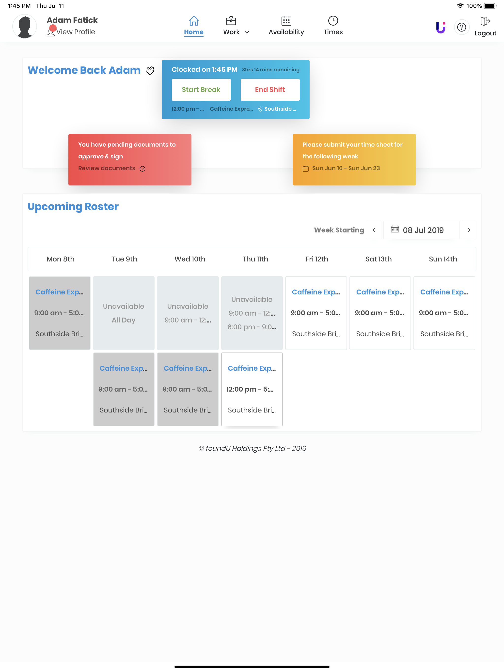 foundU for iOS makes it easy for you as an employee to clock in and out for work, update your availability, submit leave applications and manage your personal employee information from your pocket.