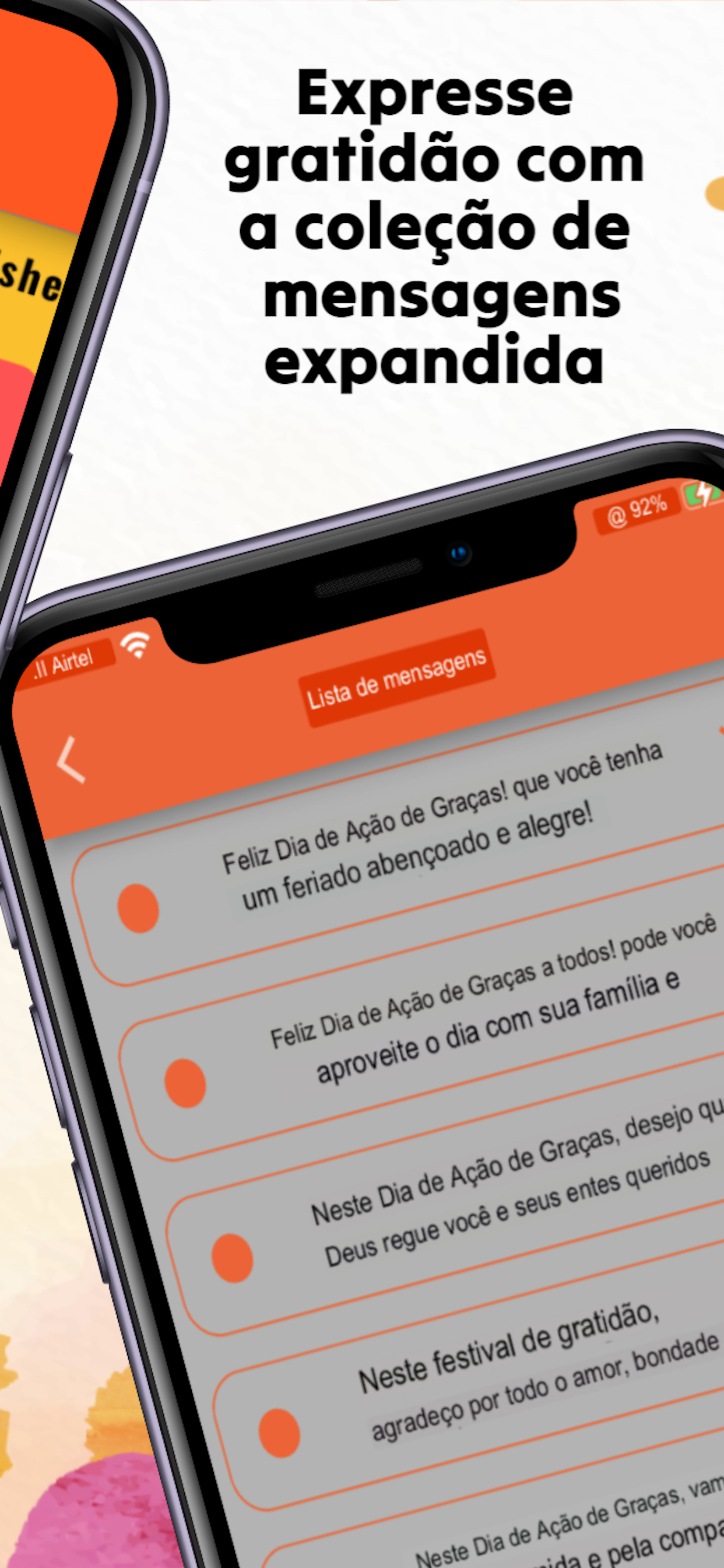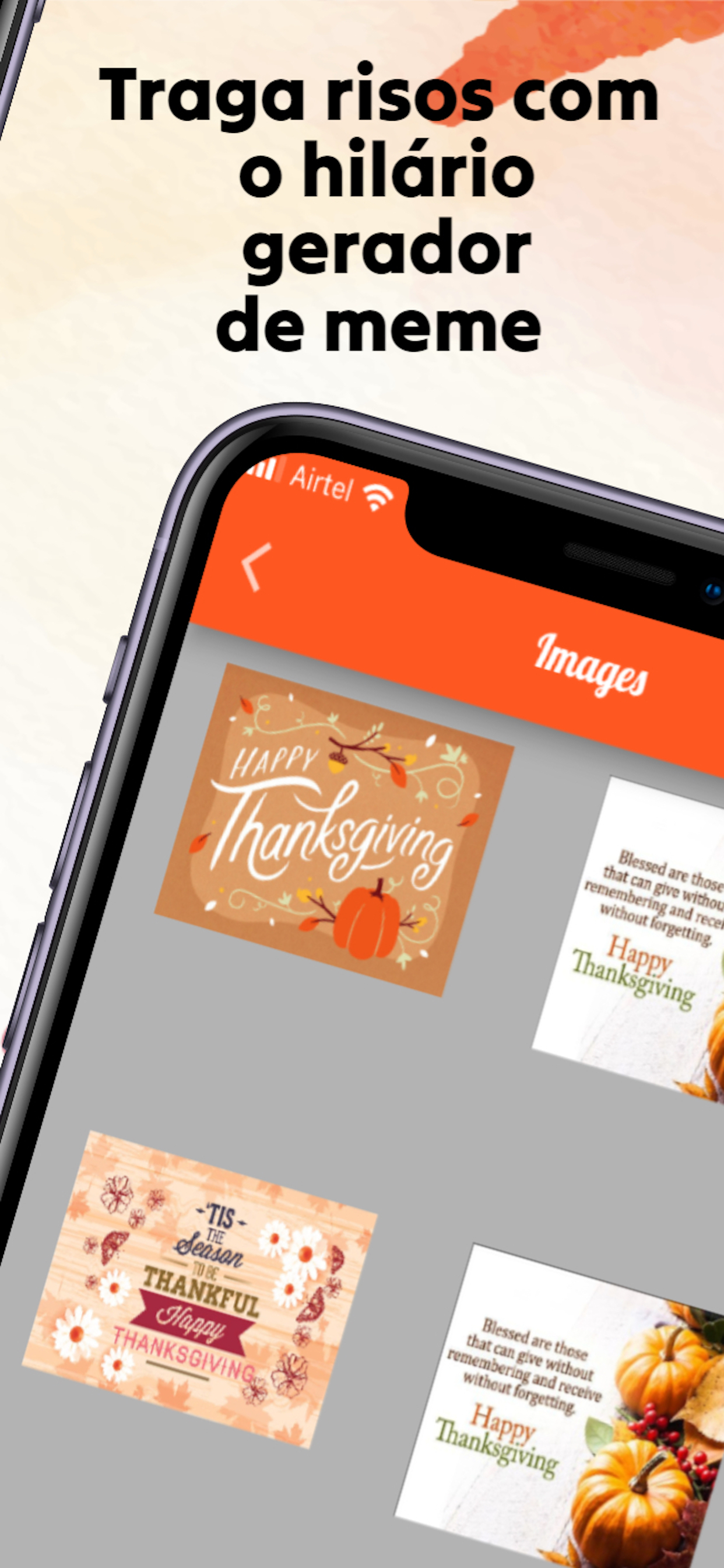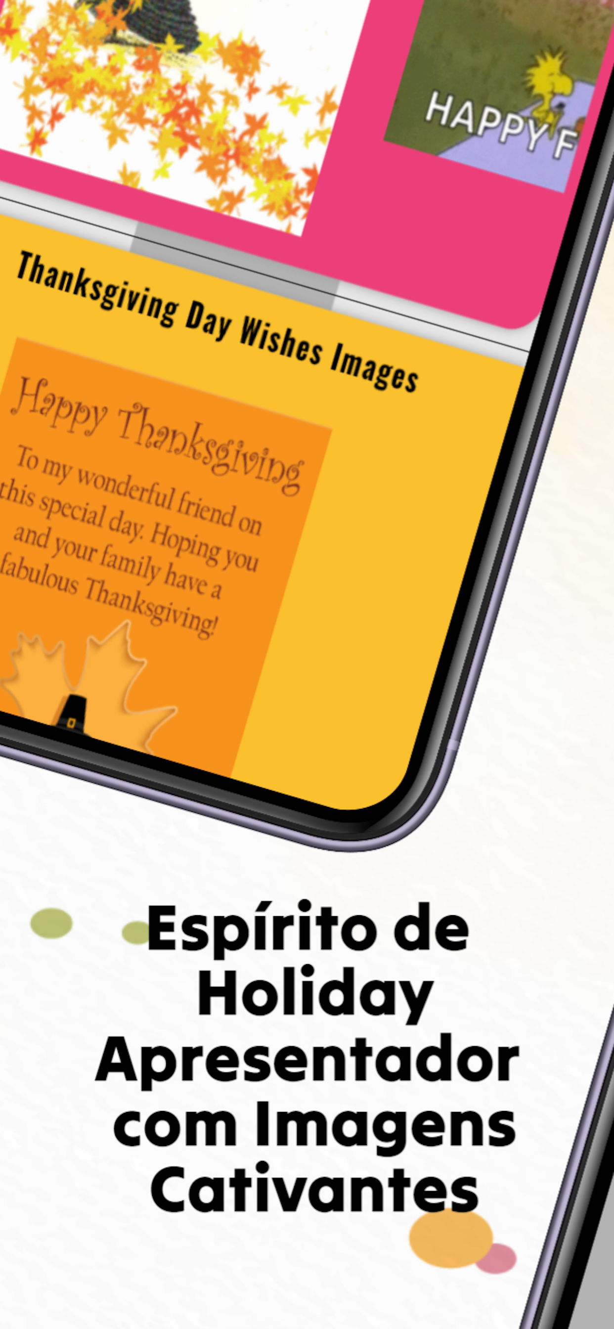 O aplicativo ""Feliz Dia de Ação de Graças"" foi projetado para aprimorar sua experiência de férias, fornecendo uma infinidade de opções para expressar sua gratidão e se conectar com seus entes queridos. Esteja você enviando mensagens sinceras, compartilhando imagens e GIFs cativantes ou criando cartões personalizados, este aplicativo tem tudo.
