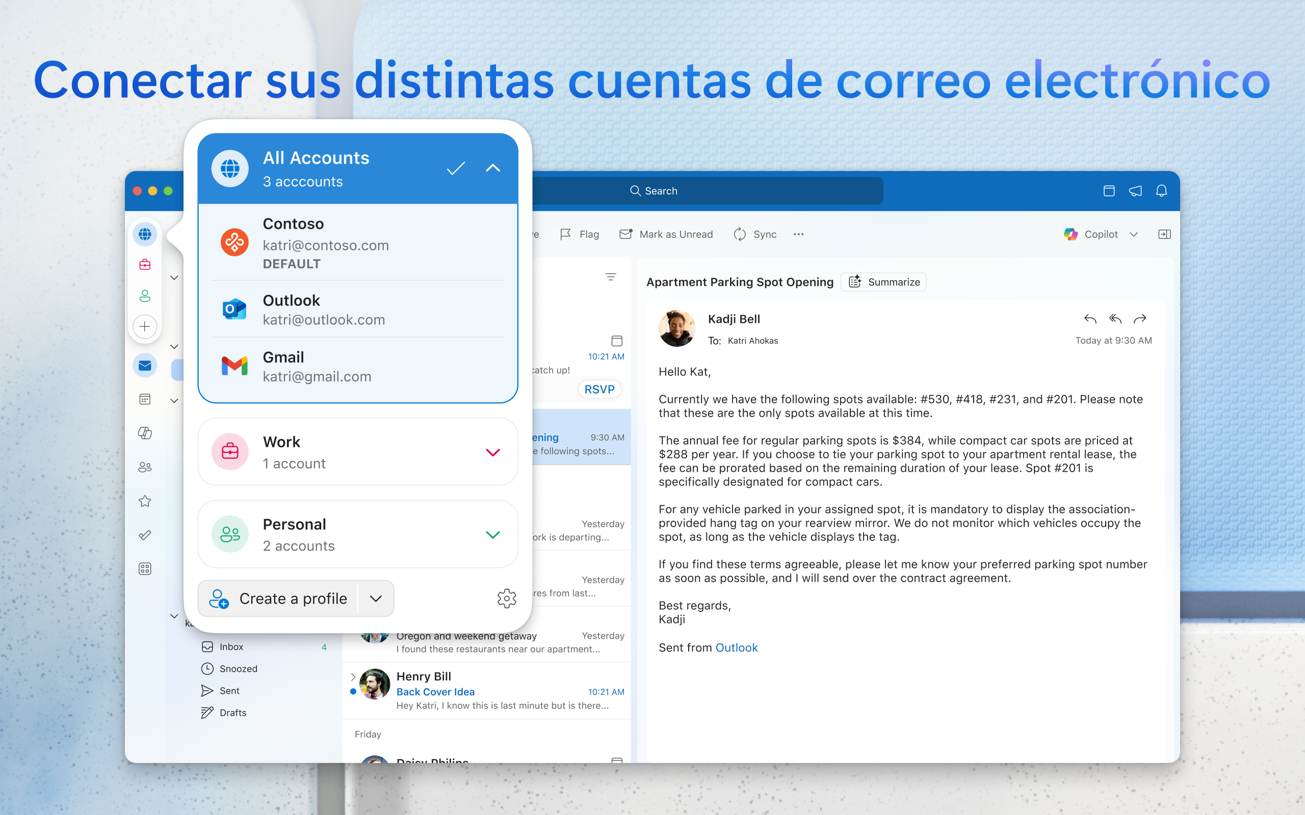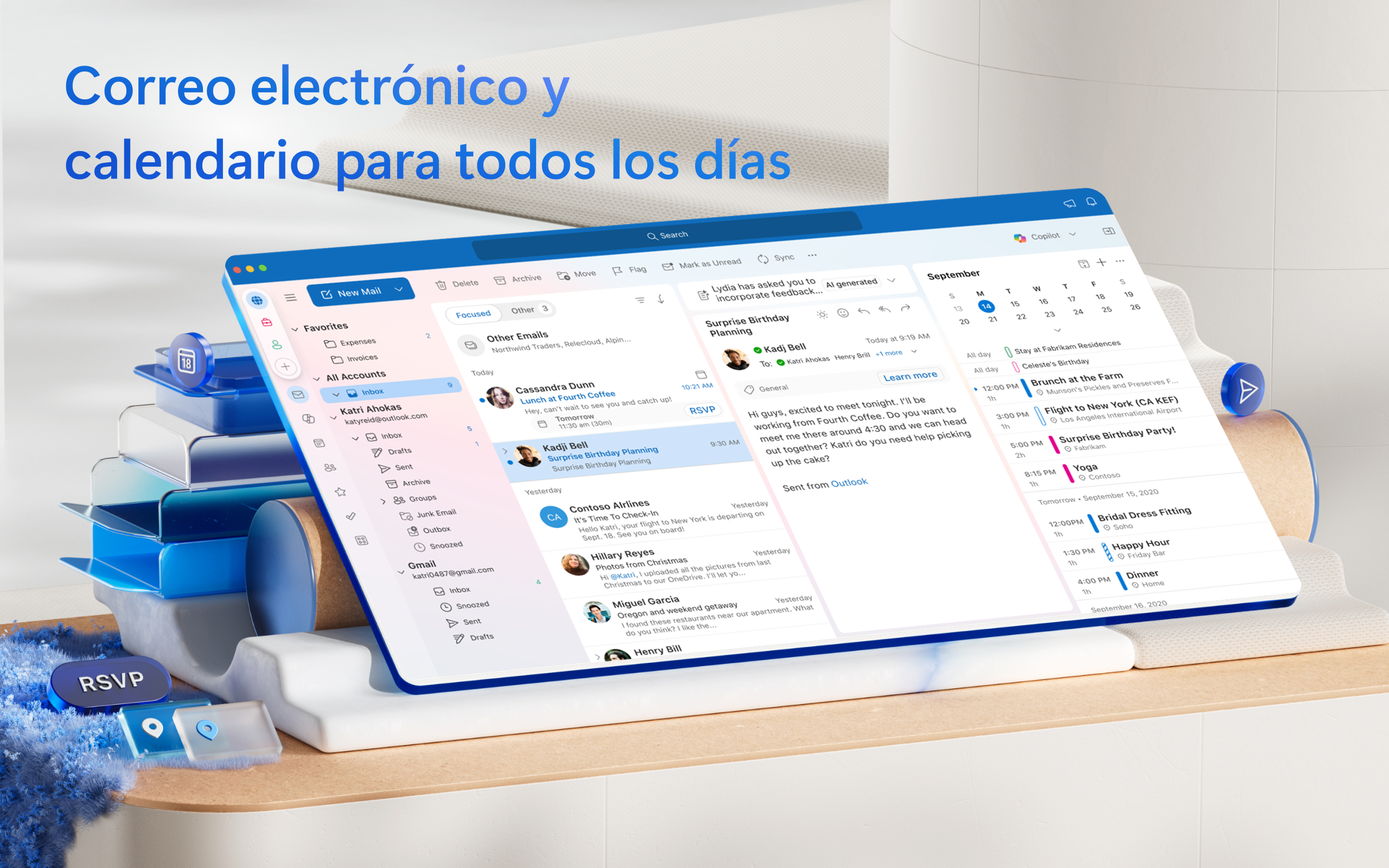 Outlook le ayuda a mantenerse conectado y organizado en la oficina y en casa con un fácil acceso a correos electrónicos, archivos, eventos de calendario y contactos en todas sus cuentas para que pueda hacer cosas rápidamente.