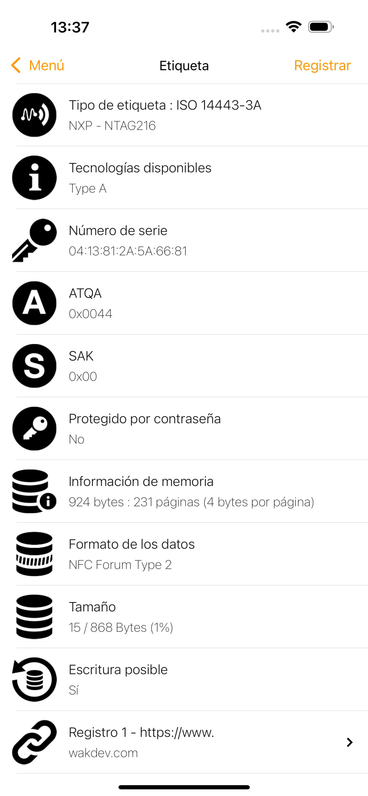 - el tipo de etiqueta (ej : Mifare Ultralight, NTAG213)