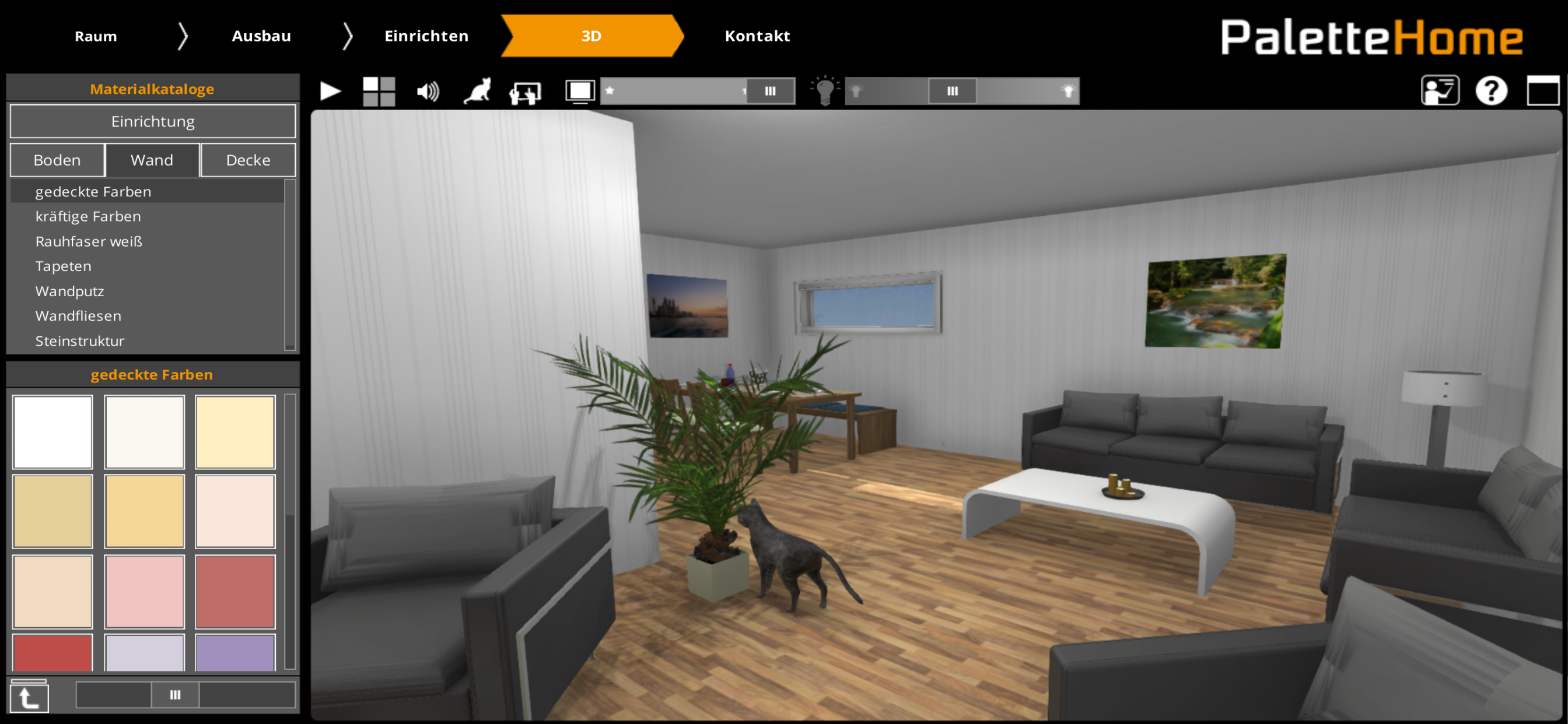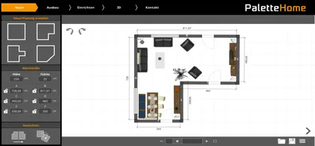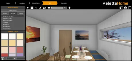 Die virtuelle Planungsapp Palette Home führt den Anwender mit der Navigation der einzelnen Planungsschritte intuitiv von Anfang bis Ende des Planungsprozesses. Dieser beginnt bei der Festlegung der Raummaße und führt über die Planung von Türen, Fenstern und - wenn gewünscht- sogar Vorwänden oder Dachschrägen. Die Objekte sind übersichtlich und griffbereit dargestellt und lassen sich schnell und einfach per Drag&Drop in die Planung ziehen. Die Ausrichtung an den Wänden erfolgt automatisch. Mit nur einem Klick ist es möglich sich frei in der 3-D Visualisierung zu bewegen. Sie können nun live Ihren selbst geplanten Raum in Begleitung unserer Firmen-Katze "Palette Cat" entdecken. Die Qualität der Darstellung und die fotorealistischen Ergebnisse sind beeindruckend.