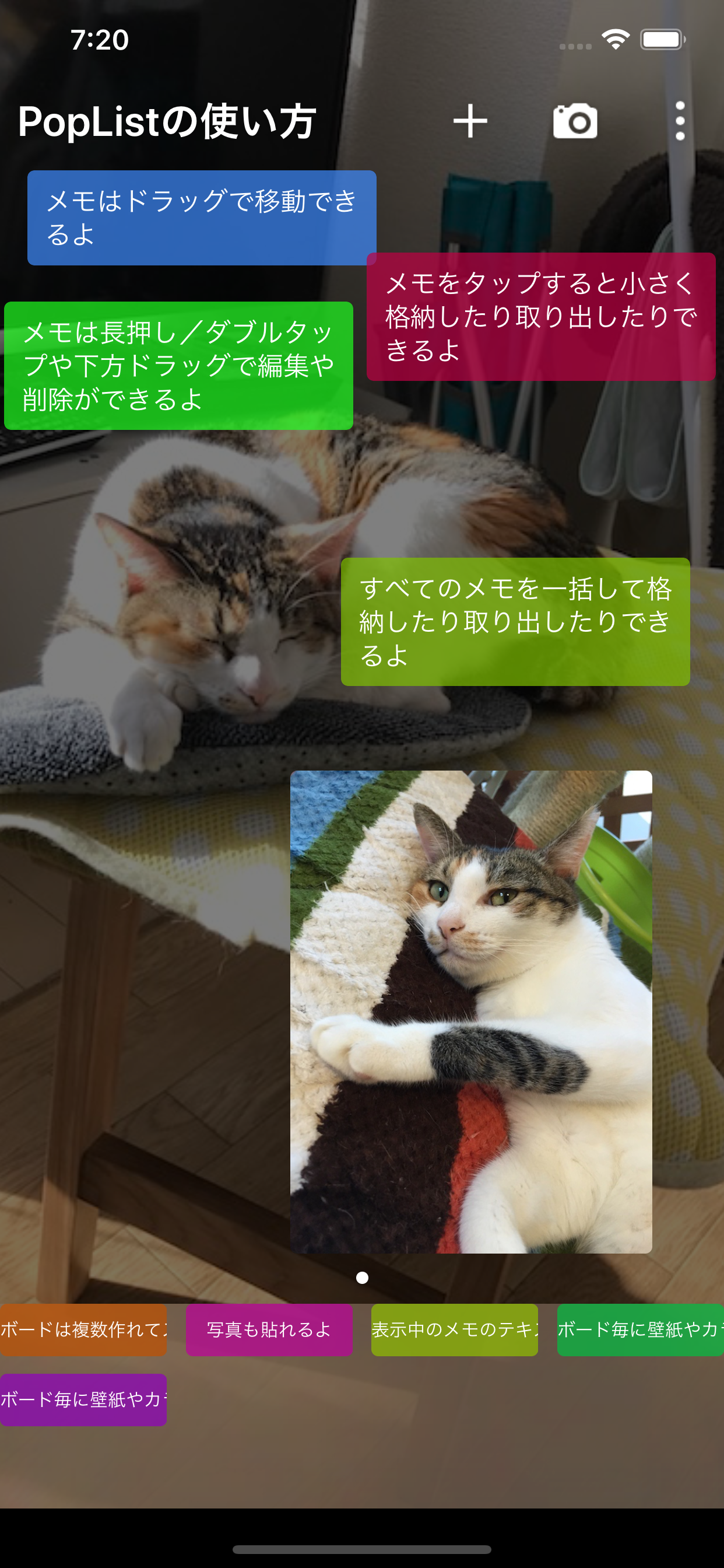付箋タイプのメモアプリ。ボードに好きに配置し、起動後にパッと見で必要なメモを発見出来る、使い易く便利なアプリです。 必要無くなったメモも、消したり他のページに移動させたりせずともワンタップで一時収納が可能なので、画面がごちゃごちゃしません。 画像で作ったメモも極端な縮小やトリミングをされないので、見易いです。 現状でも無くてはならないぐらい便利に使わせて貰っていますが、三つほど要望を書かせて頂きます。 1:メモの長押しで出るメニューに、コピーの項目が欲しいです。 共有→コピーだと一手間が結構気になります…。 2:選択したメモを他のボードに移動させる機能が欲しいです。 3:新規メモは編集時のようなもっと行数の多い画面が良いです。一行だと書き難いです…。いっそ新規メモから直接編集画面で良いぐらいです。 付箋タイプのメモアプリは他にもありますが、このアプリには他にはありそうで無くて、欲しかった機能が備わっています。 要望など偉そうに書かせて頂きましたが、今のままでも便利な事は間違いありません。