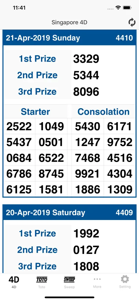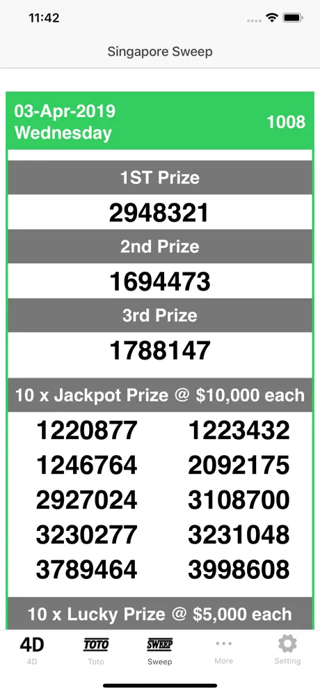 With every effort made to ensure the accuracy of the 4D results published on this App, we do not warrant its accuracy for several reasons including time delays incurred in completing necessary updates.All contents/4D results provided herein is solely for information purposes and is provided on an "As Is" basis only without any warranty or representation of any kind, expressed or implied, as to their accuracy, completeness, timeliness or otherwise. In no event shall the owners of this App have any responsibility or liability for any damage and/or losses incurred (whether arising directly or indirectly) in connection with any accuracy, timeliness, errors, omission and/or information appearing herein and/or on the website.All logos, brands and product names referenced herein are the trademarks or registered trademarks of their respective holders. This App is not affiliated to any of the organisations linked or described. We do not provide, promote or encourage any form of gambling services / activities.This app is developed and provided independent of the involvement of Singapore Pools. To the extent that the reporting of 4D ,Toto & Sweep results may be inaccurate, please note that such inaccuracies are not the responsibility of and should not be attributed to Singapore Pools.