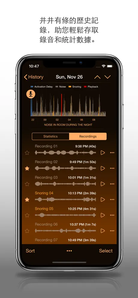 完整的歷史記錄和漂亮的圖表,對睡眠週期進行分析和統計。