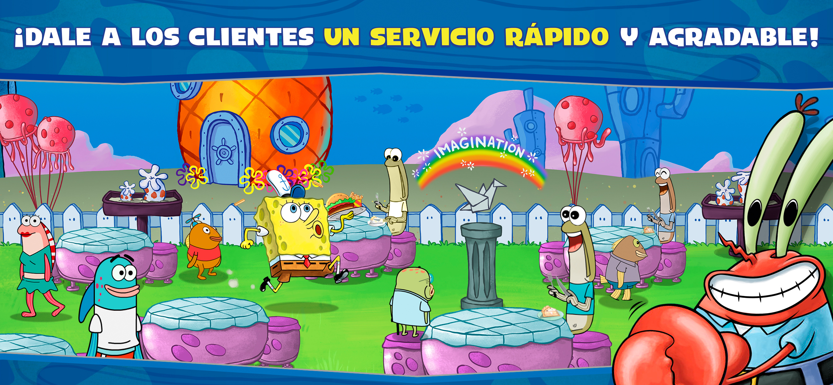 Cocina y sirve comida deliciosa como Burger Cangreburgers, tortitas, barbacoas, ¡y más! Ponte detrás de la parrilla como Bob Esponja para proporcionar servicio rápido a los habitantes de Fondo de Bikini. Servirás a montones de caras familiares como Patricio Estrella, Arenita, Calamardo ¡y muchos más! ¡Mantén a tus clientes contentos y recibirás recompensas como propinas, buenas opiniones y emocionantes bonificaciones! ¡Comienza como cocinero junior de frituras y entrénate para convertirte en uno de los mejores chefs de comida rápida de Fondo de Bikini!