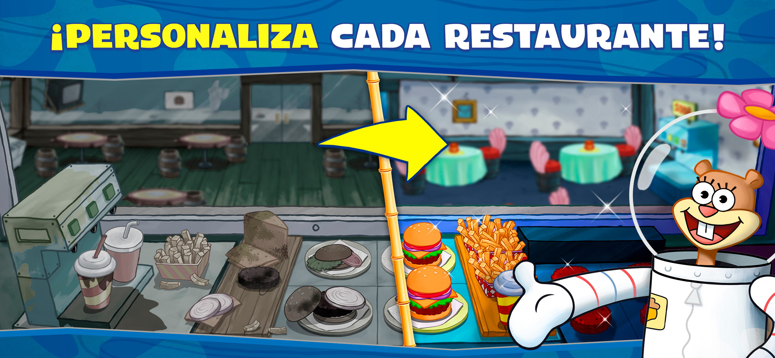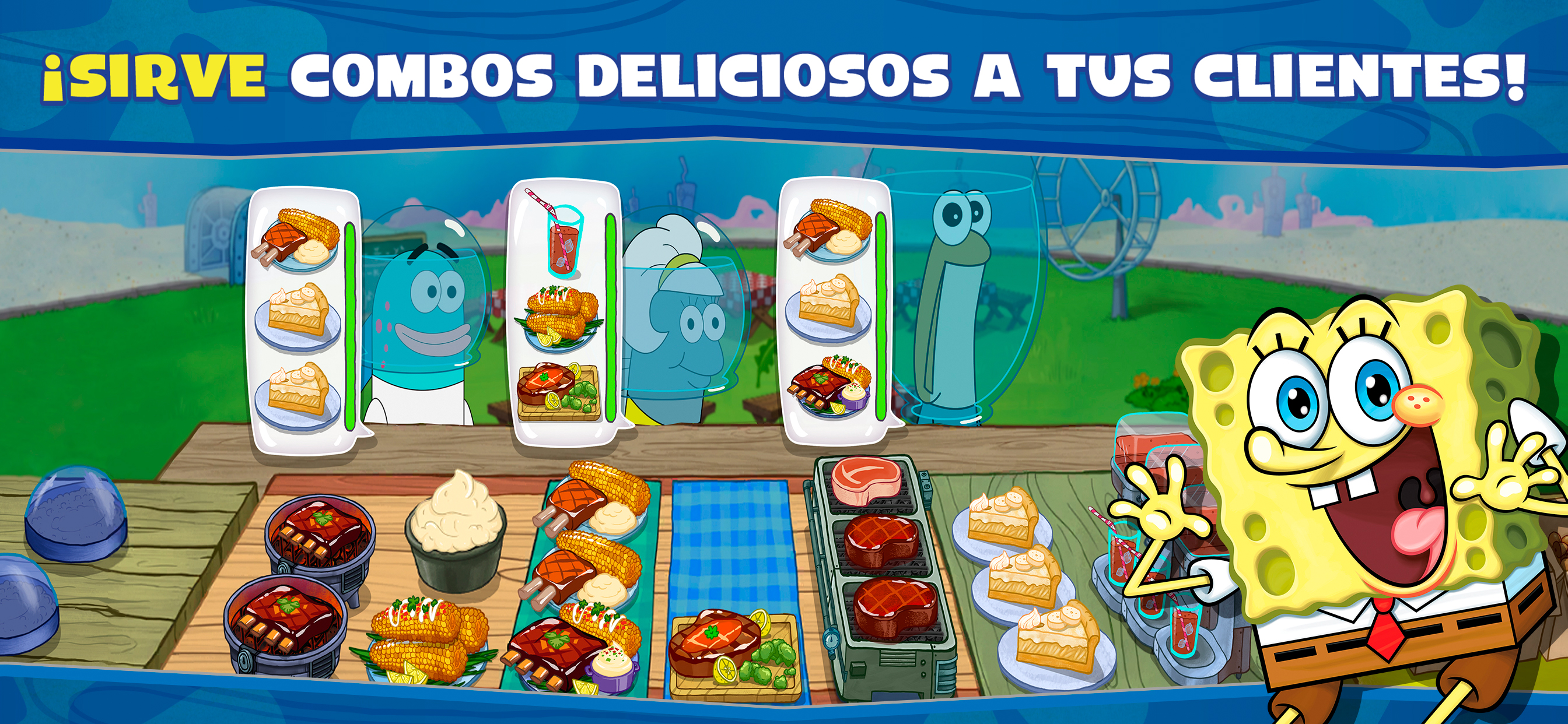 Prepara deliciosas Burger Cangreburgers en el Crustáceo Crujiente, filetes y costillas en la Casa de Arenita, perritos calientes en Weenie Hut Jr y mucho más mientras exploras restaurantes familiares y cocinas nuevas en Fondo de Bikini, Laguna Viscosa ¡y más allá! Podrás encontrar cocinas y restaurantes nuevos con regularidad, ¡lo que aporta nuevos desafíos culinarios y recetas para aprender!