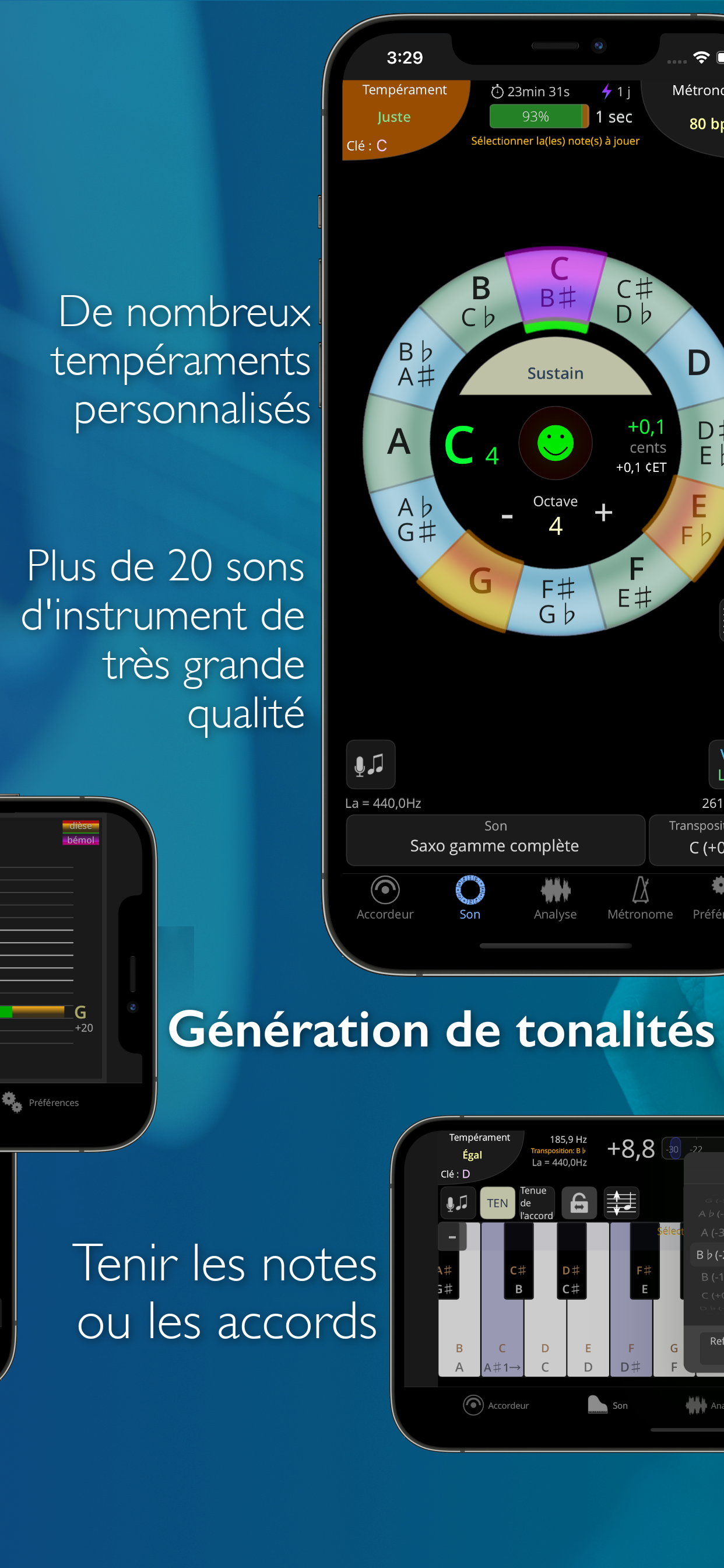 • Les possibilités d'entraîner son oreille sont infinies. Les sons d'instruments symphoniques multi-samplés, d’une qualité exceptionnelle, sont uniques comparés aux autres apps d'accordage. Les capacités d'écoute peuvent être développées grâce au clavier de huit octaves, à une molette chromatique et au générateur de tonalités.