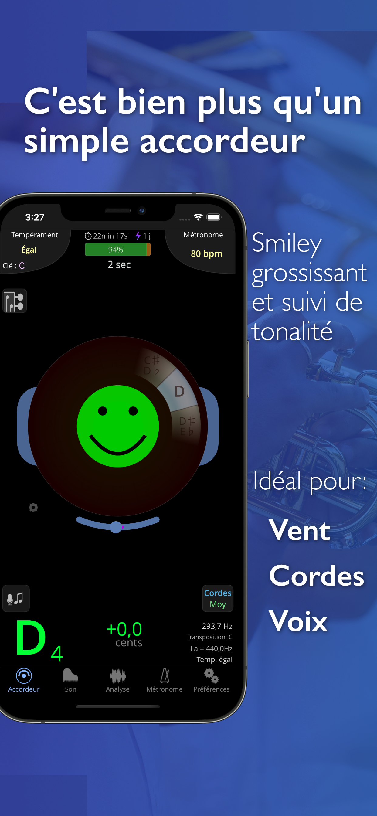 Cette app propose un ensemble d'outils de pratique ainsi que des commentaires drôles et pertinents à tous les musiciens, pro ou débutants, qui chantent, jouent d'un instrument (cuivre, à vents ou à cordes). Bien plus qu’un accordeur !