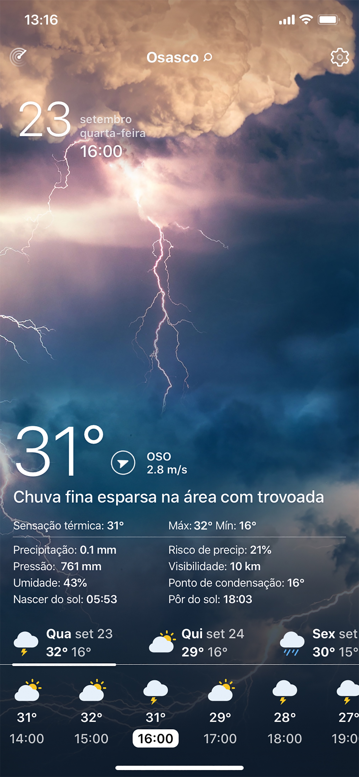 O APP é bonito visualmente, cheio de informações, porém o mais importante nesses aplicativos de tempo é a precisão. Hoje está marcando chuva porém na minha localização esta apenas nublado com nuvens brancas.