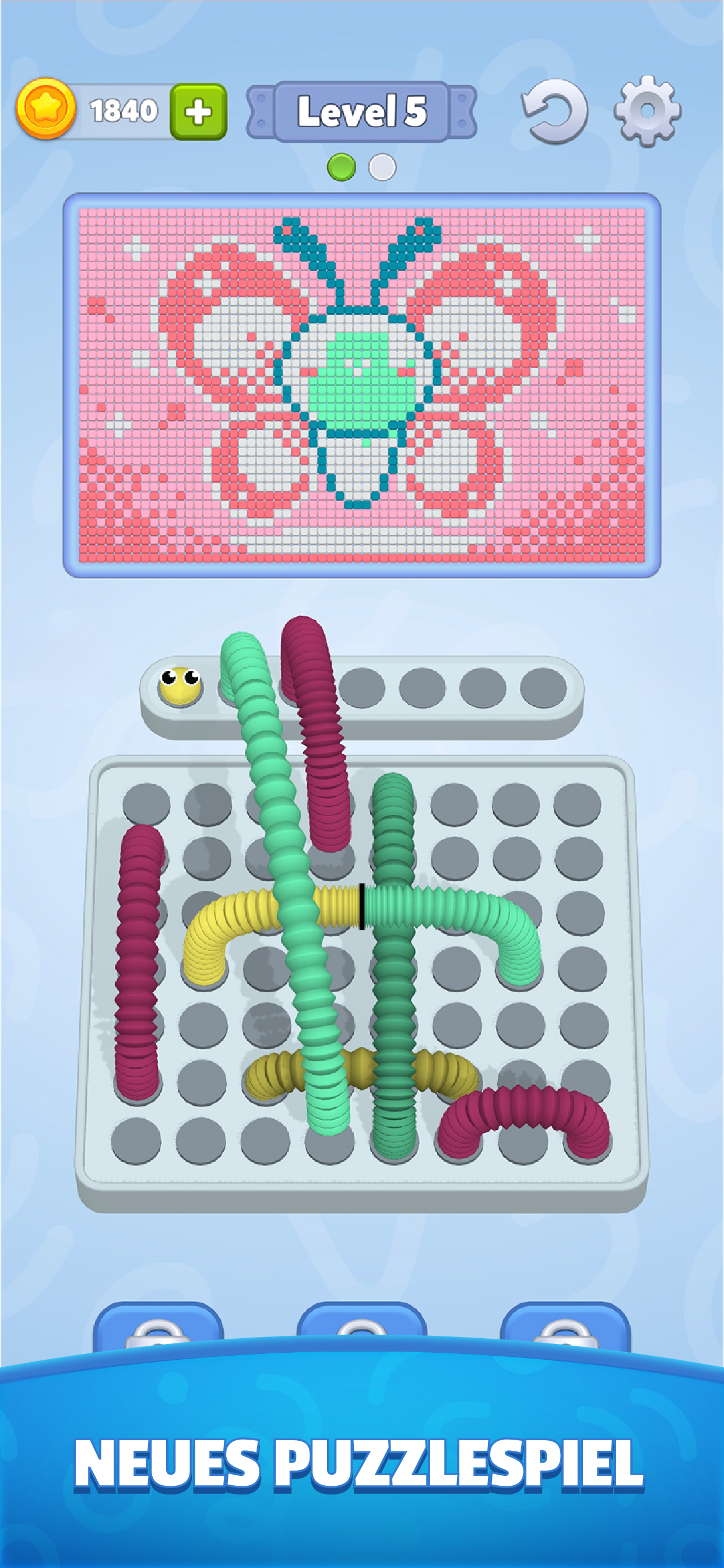 Jedes Level beginnt mit einem leeren Fadenbrett und einem bunten Wirrwarr aus Röhren darunter. Tippe auf die Röhren, sammle drei derselben Farbe in deinem Regal und kombiniere sie, um sie auf die Leinwand zu legen. So entsteht langsam ein verborgenes Pixel-Art-Mosaik – Stück für Stück, mit jeder Entscheidung.