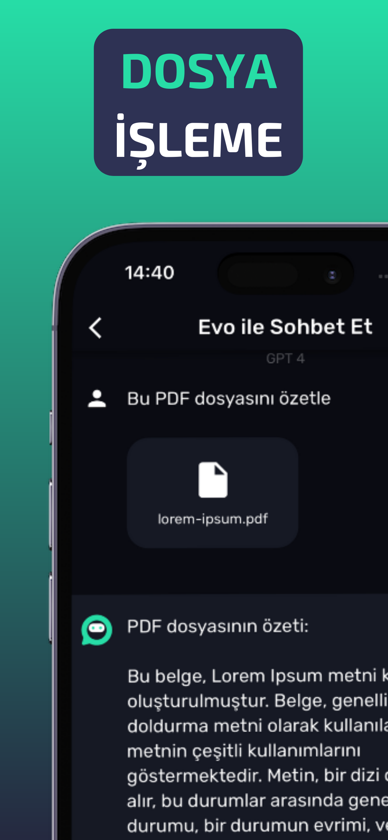 Uzun PDF’leri, belgeleri veya makaleleri Evo’ya özetlettirerek zamandan tasarruf edin. Evo ayrıca metinleri analiz eder, ana noktaları çıkarır ve kolayca çok dillere çevirir.