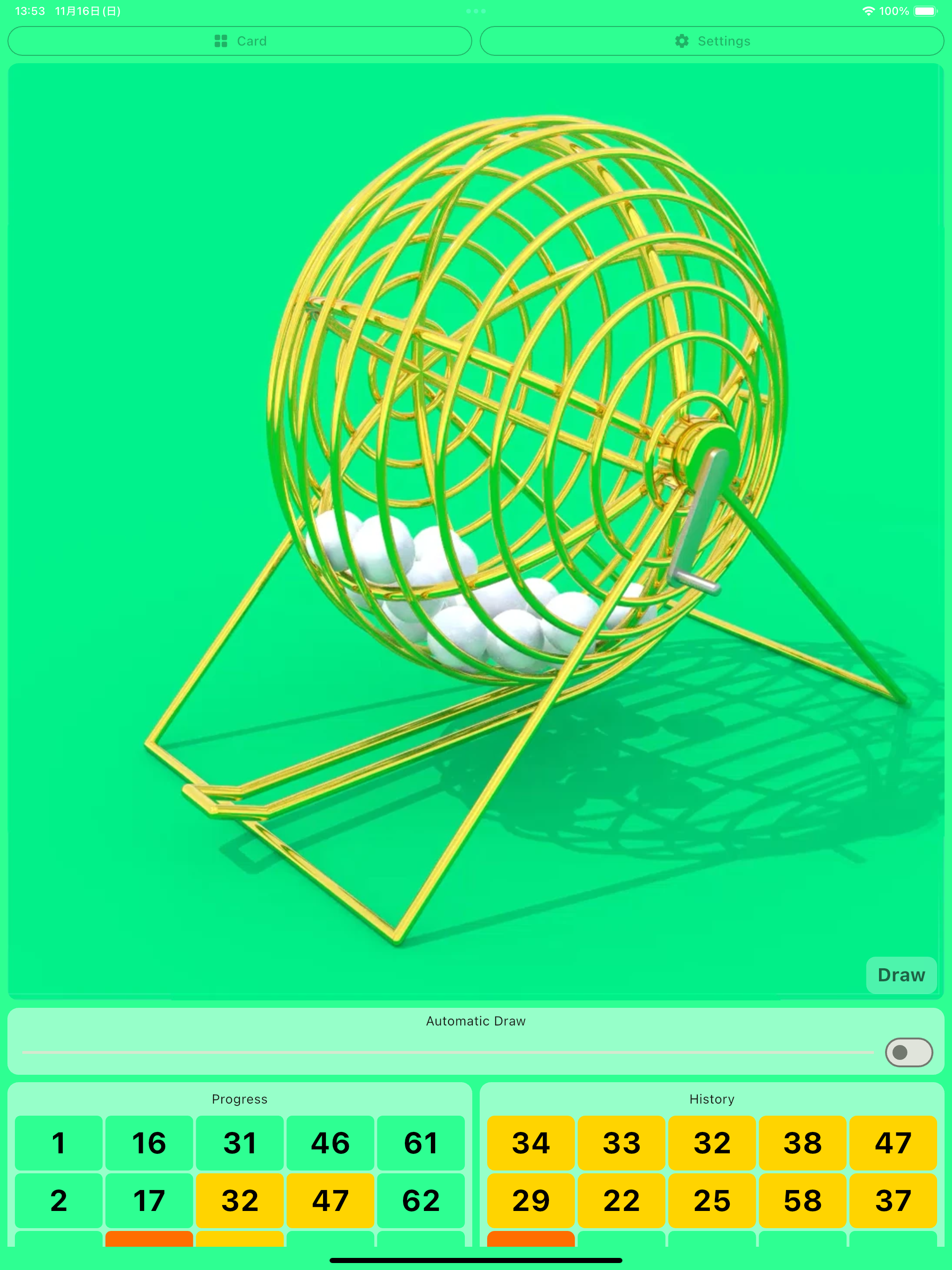 该应用还具有卡片功能,因此多人可以仅使用此应用享受宾果游戏。一人作为主持人操作宾果机,另一人作为参与者使用宾果卡。
