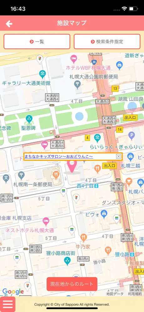 保育所や幼稚園、さらにはオムツ替え・授乳スペースがある公共施設等をマップで検索でき、現在地からのルート検索もできます。