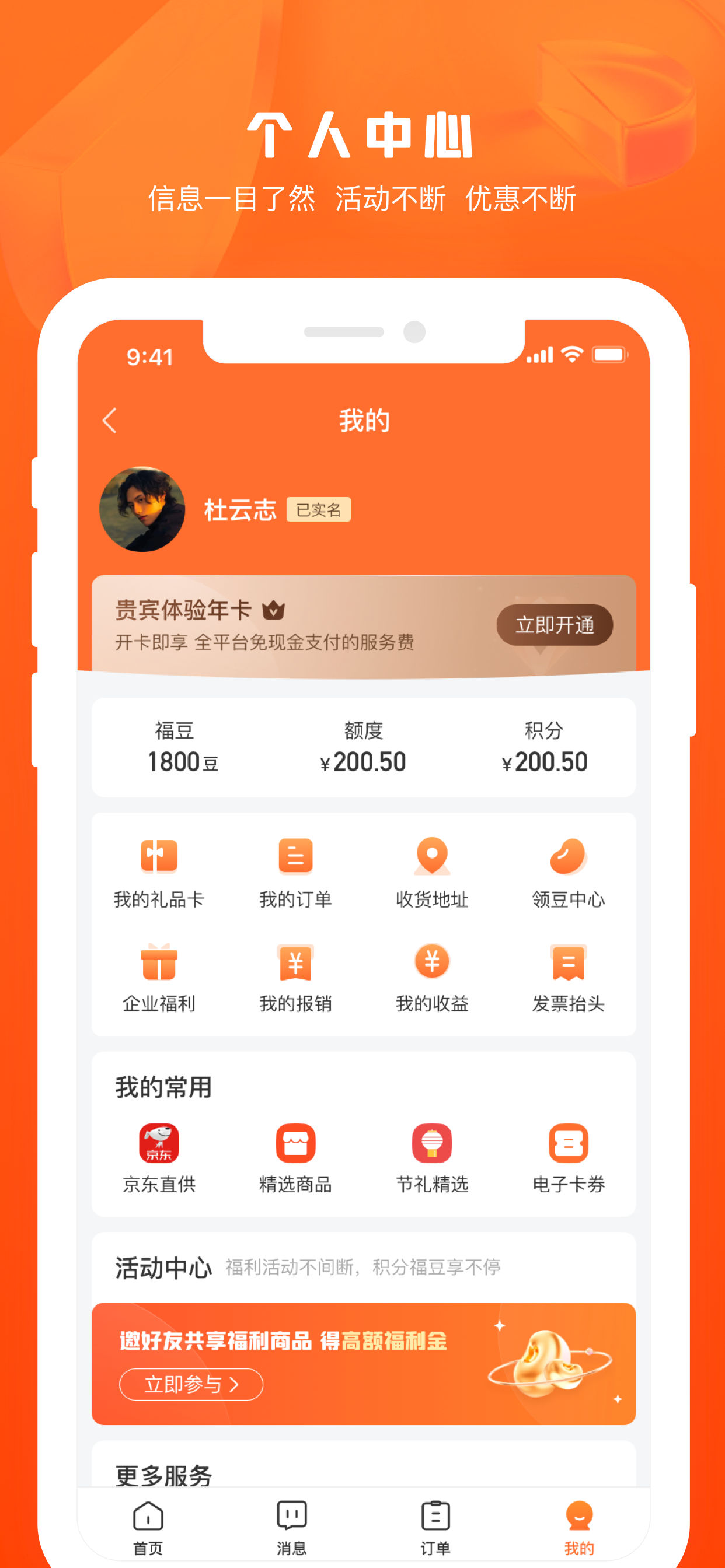 为个人提供礼品商城、为员工提供福利消费;用户可享有福豆兑换、礼品卡购物、福利关怀。
