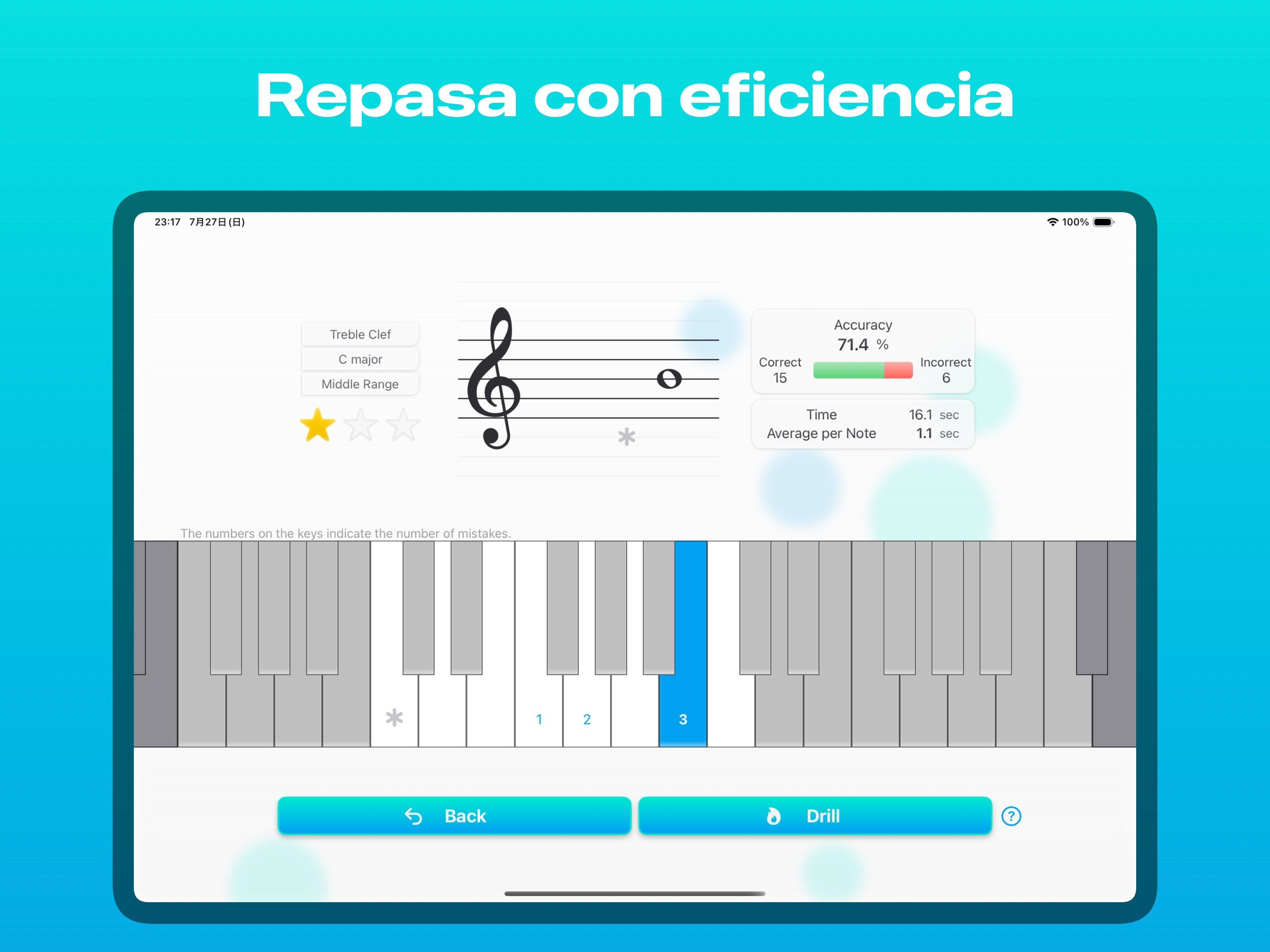 とても良く出来ていてデザインも操作も快適ですが、譜読みを練習するのは加線が多い音符を即座に読めるようになるためなので、もっと音域を広くしてもらうと嬉しいです。