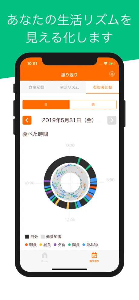 記録した起床・就寝・食事記録のデータをもとに生活リズムを見える化します。
