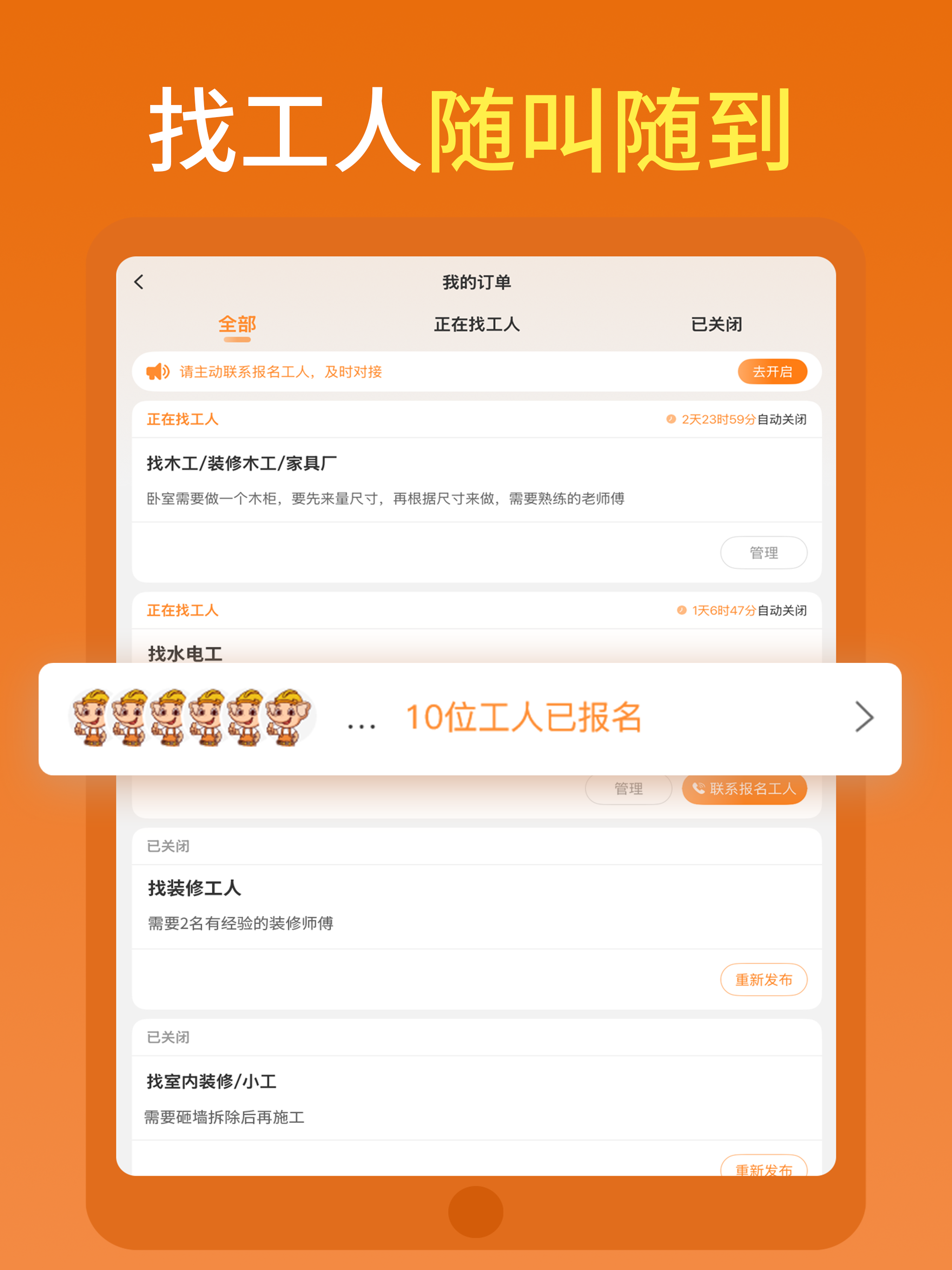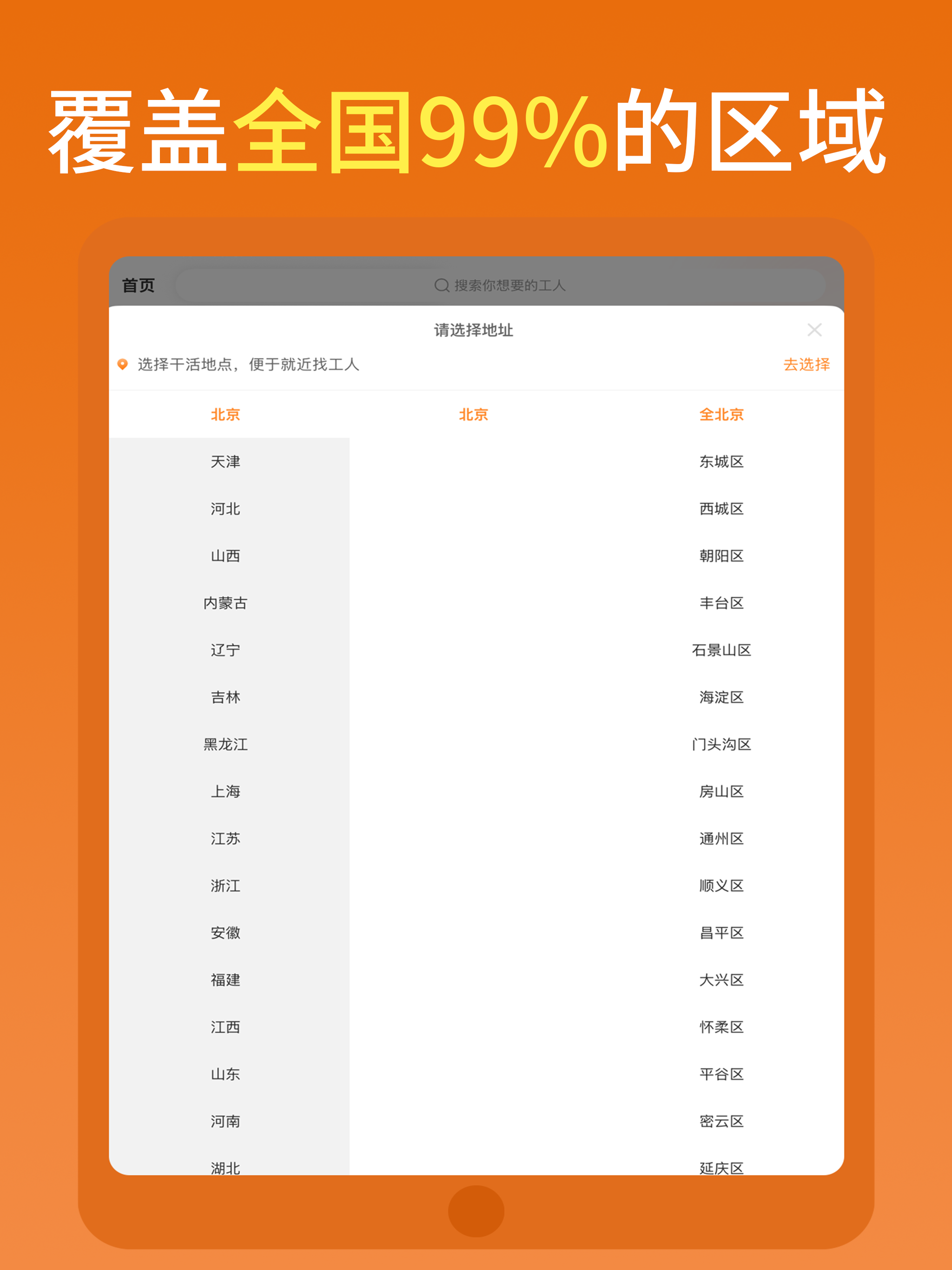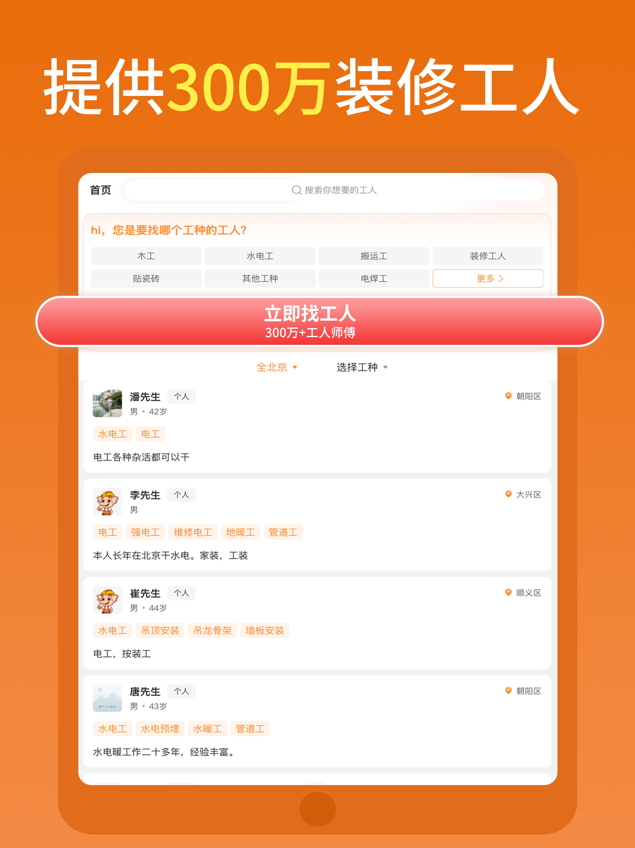 【快速找人】平台有300万工人师傅,覆盖全国3000个区县和乡镇,找工人随叫随到。