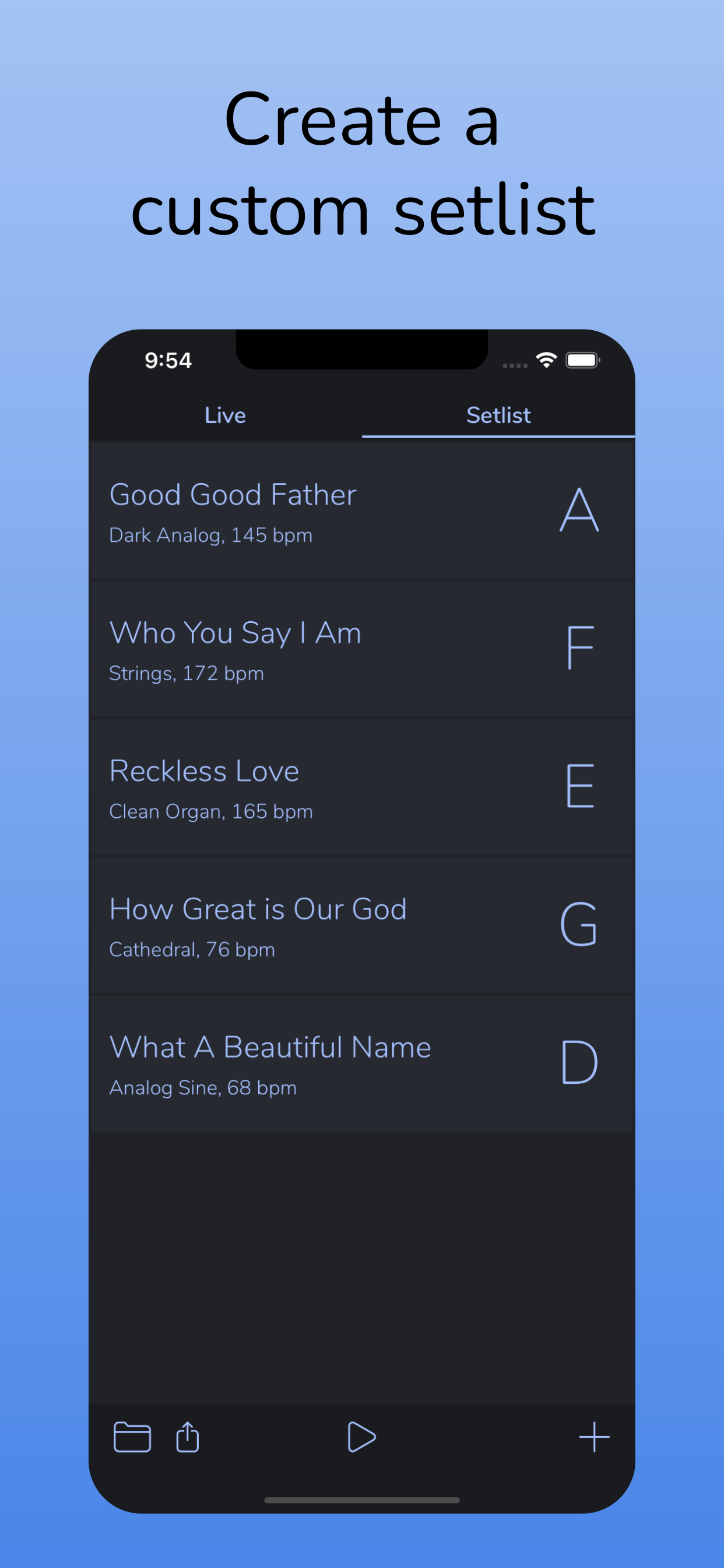 I switched over to this from Multitracks. This app does all the right things. Nice big buttons if you just want a simple layout for ambient pads, or build an actual set list with the ability to specify the metronome tempo, the key, and the specific type of pad for each song. You can import custom pads, which I did because I had some that I had purchased from Multitracks, but I don’t use them because the supplied AP pads are actually better. A small and overlooked feature that I appreciate is that when going from one song to the next, this app lines the click tracks up with one another (unlike Multitracks), which is helpful if you do a key or time change in the middle of a song and you need to keep the metronome going. One missing feature I would love is the ability to save individual songs instead of just the set lists, that way I can just build each song in once and then build my set list quickly each week by selecting songs from my song library.