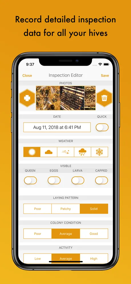 Use quick inspections for when a few notes is all thats needed or record more detailed information on frame count, cells, activity etc with a few more taps, making accurate record keeping simple and fast.