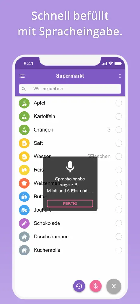 Dank großer, erweiterbarer Artikelsammlung von nahezu 1000 kategorisierten und priorisierten Artikeln und intelligenter Suchfunktion. Beim Eingeben des ersten Buchstaben erscheint in der Regel bereits der entsprechende Artikel. Oder Du fügst Artikel einfach aus der eigenen Historie hinzu. Mengen, Einheiten und Kategorien werden automatisch erkannt - auch bei Verwendung der Spracheingabe.