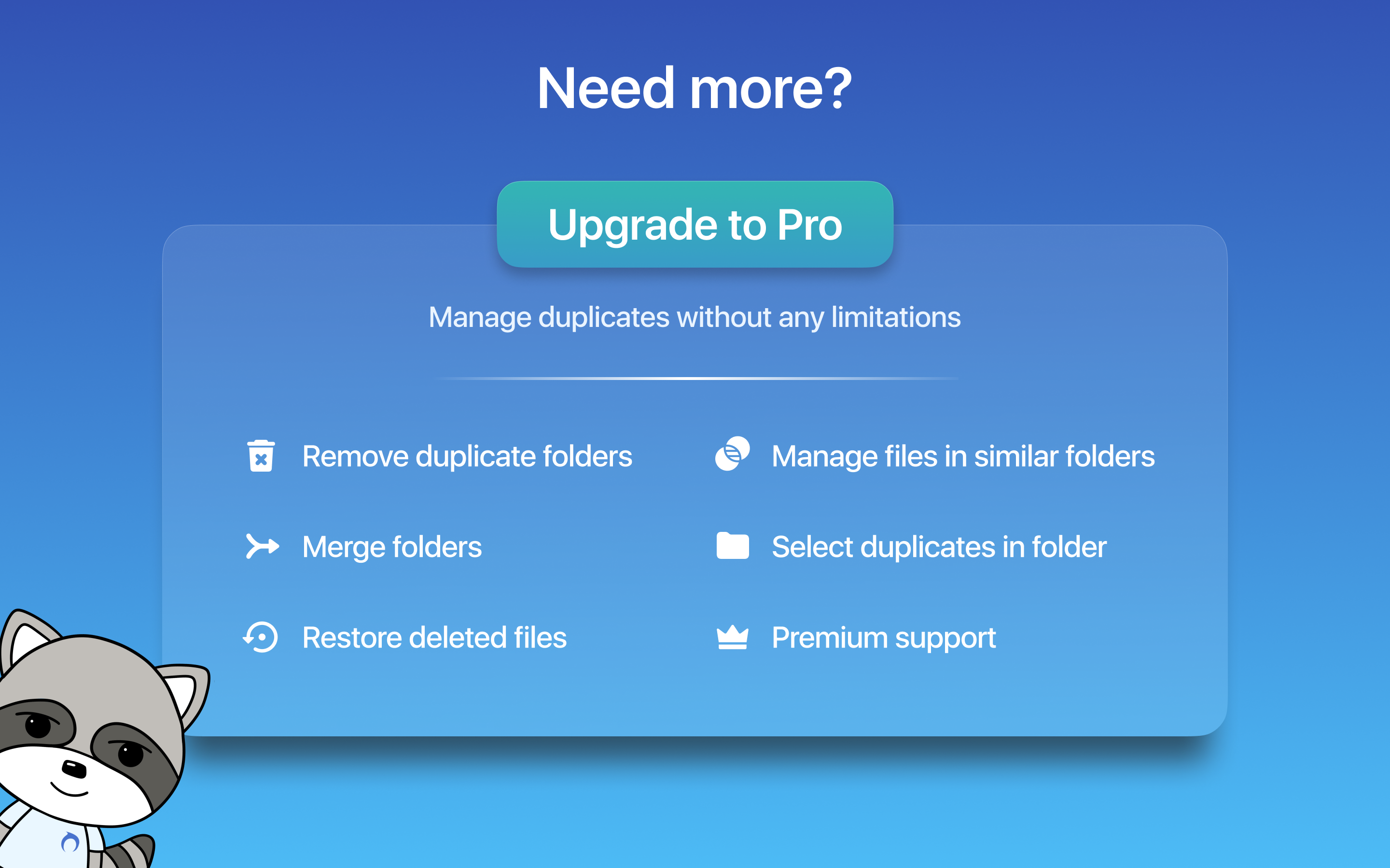 Use Duplicate File Finder FREE to find and remove duplicate files and similar media. Get the Pro version to delete duplicate folders, manage similar photos and music files, merge any folders, mass-select duplicates, and more.