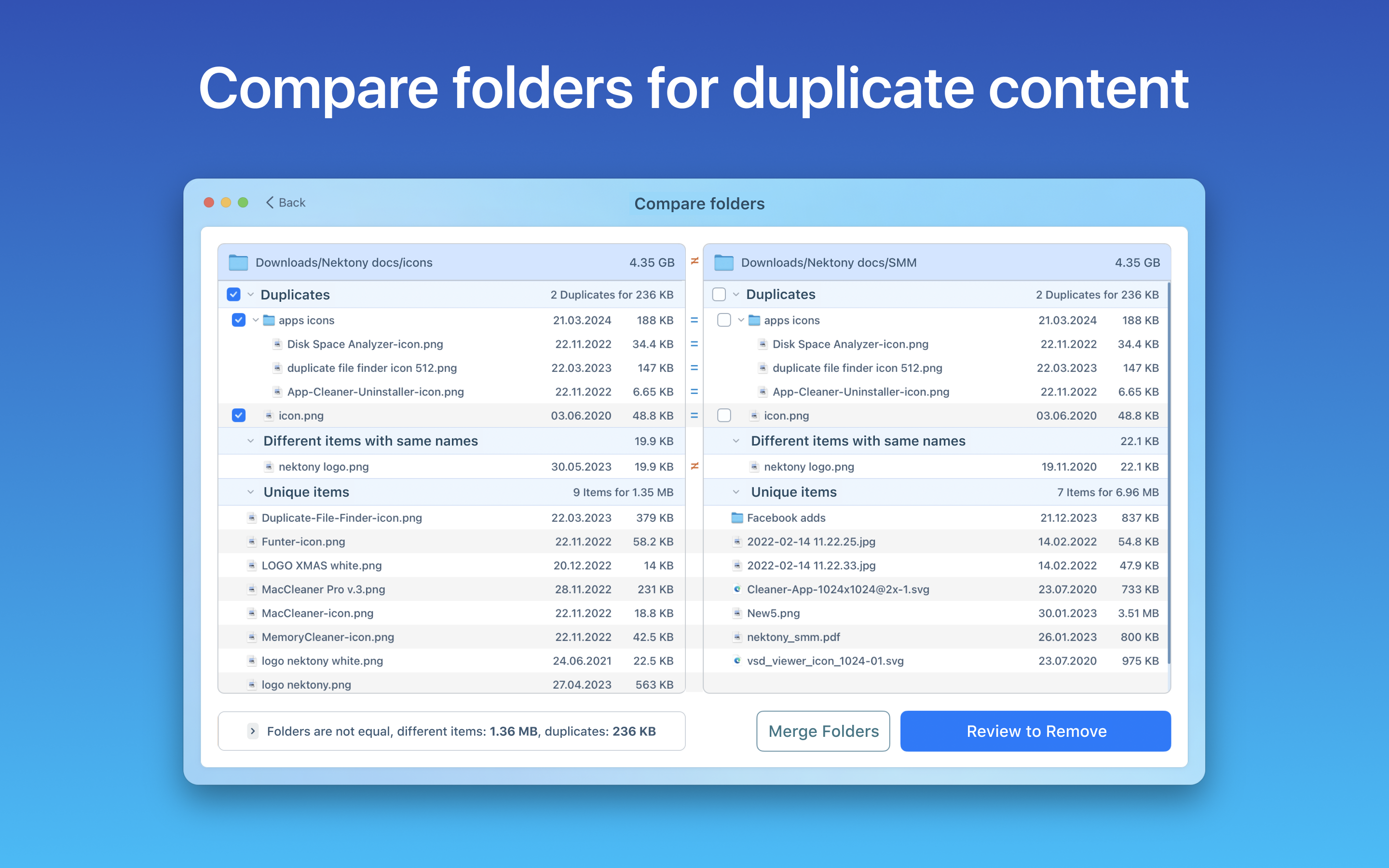 • Preview similar folders - the folders with duplicate and unique files