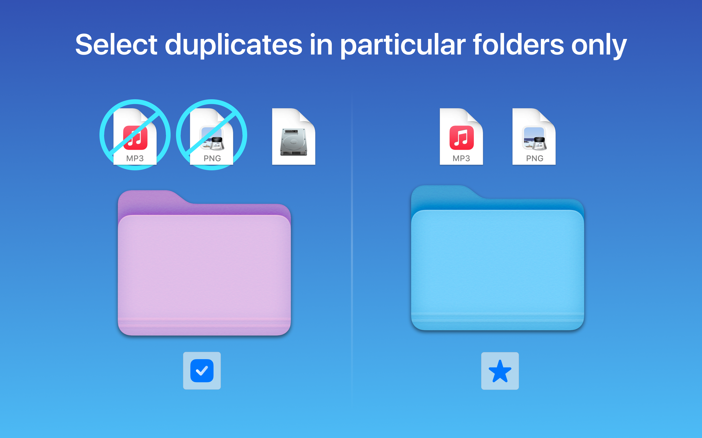 • Find duplicates in any folder, disk, mounted folder, or storage