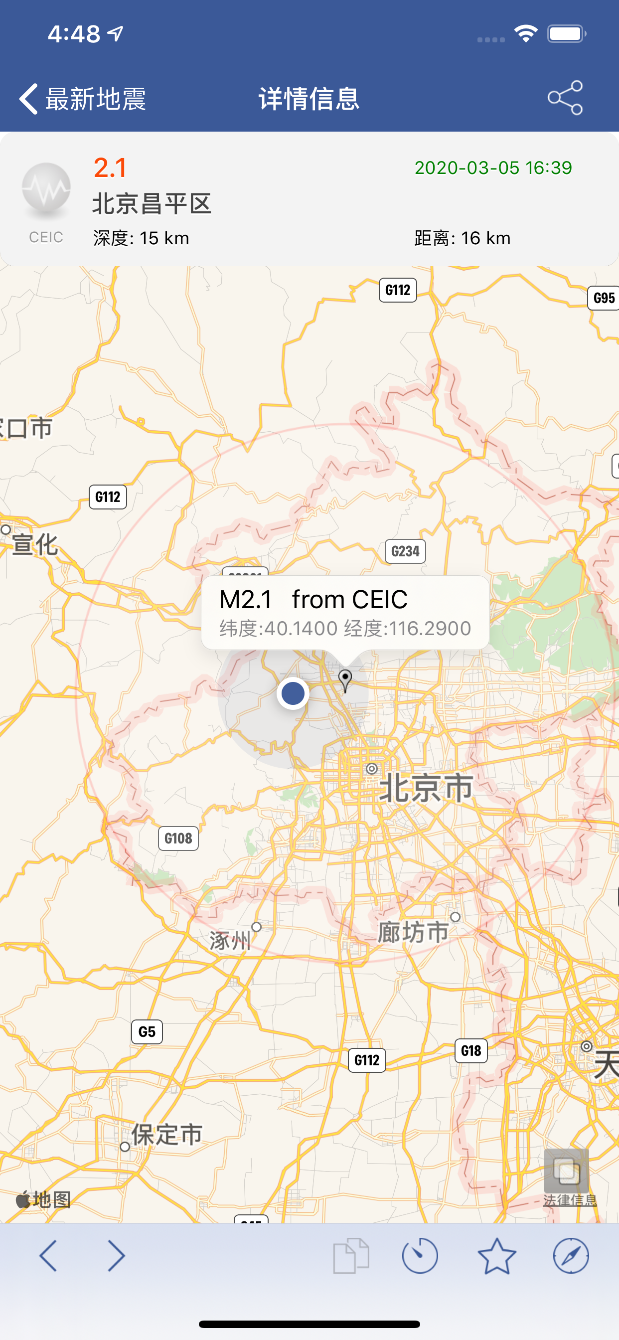 关键时候没起作用。这次成都青白江区的地震,APP完全没有通知,都是自己已经感受到了摇晃后,赶紧打开APP,结果列表里面最新的一条还停留在昨天。一直刷新,也无更新。直到一个多小时后,才更新了列表。反复检查了设置,都没问题,包括台网设置,震级设置等,该打开的通知也都打开了,网络也是通畅的。虽然这次地震没有造成实际损失,但是如果真遇到破坏性地震呢,这款APP就失去了存在的意义。