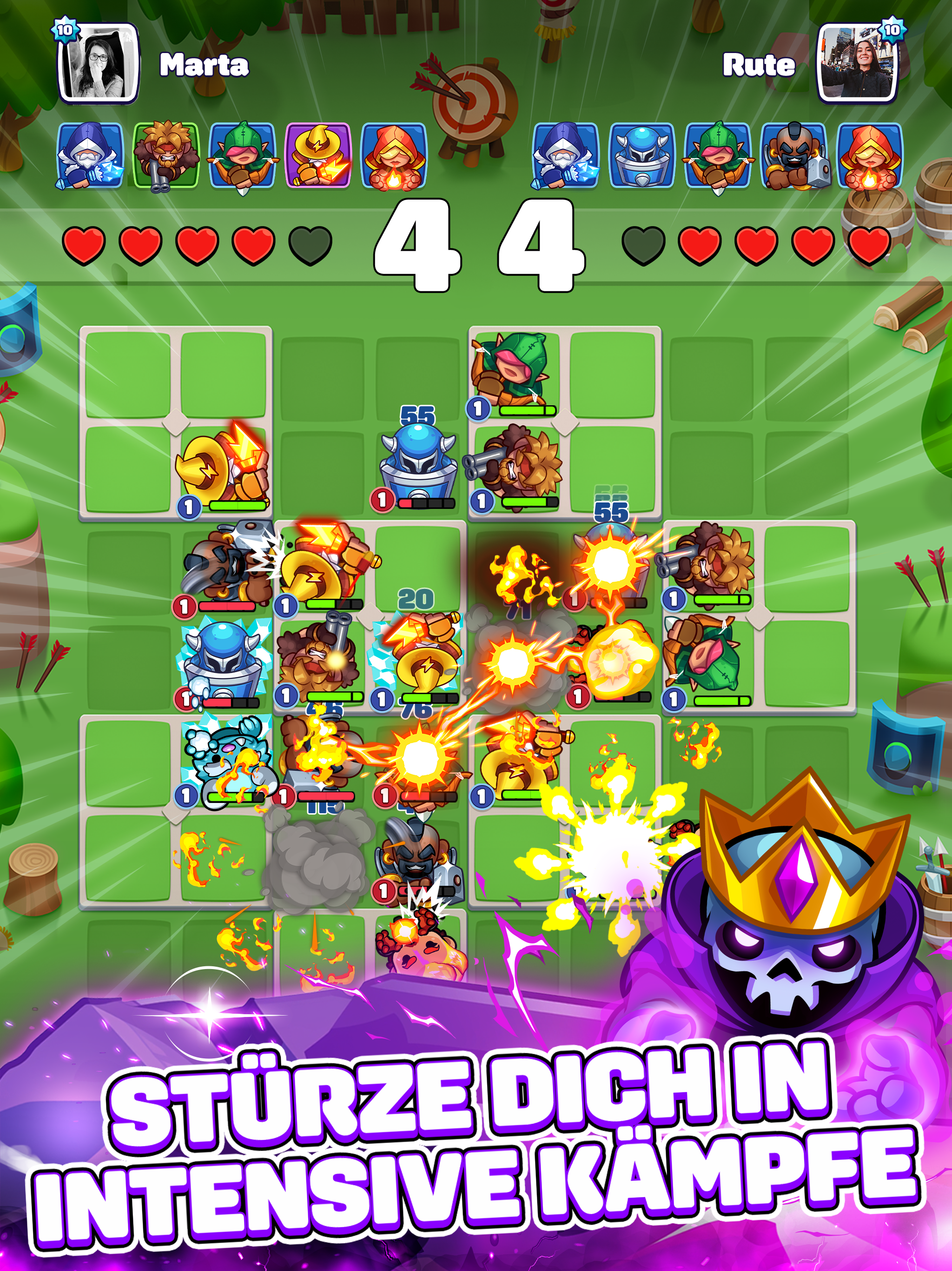 In diesem fesselnden Strategiespiel, das von den besten Elementen des Genres inspiriert wurde, zählt – wie erfahrene Spieler wissen – jede Aktion. Du vereinigst identische Helden, nutzt einzigartige Fähigkeiten und schaffst Synergien, die die Konkurrenz in den Schatten stellen.