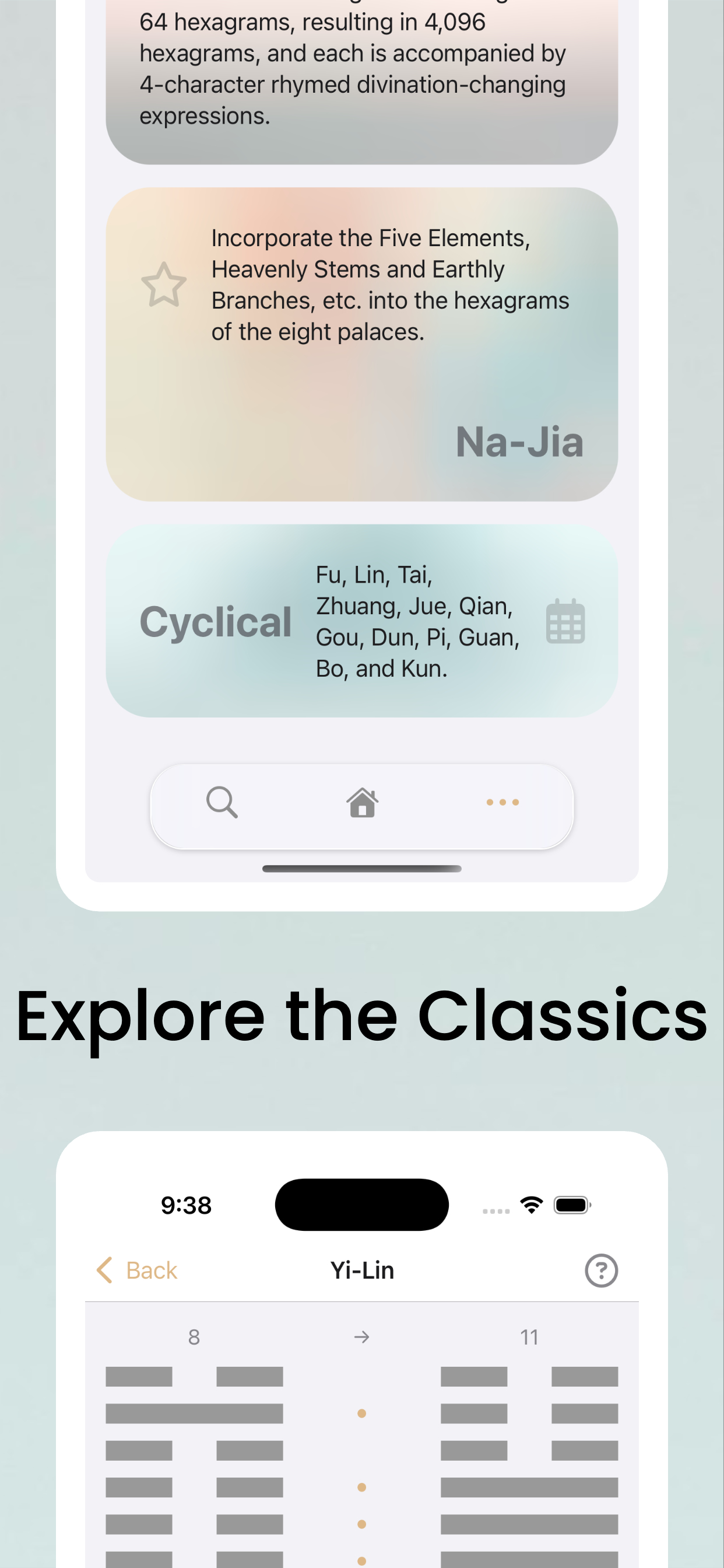 * Incorporates classical schools such as Jing Fang Na Jia, Cyclical Hexagrams, Yi Lin, and Zhu Xi’s variant divination methods in an interactive form for easy reference, comparison, and practice.