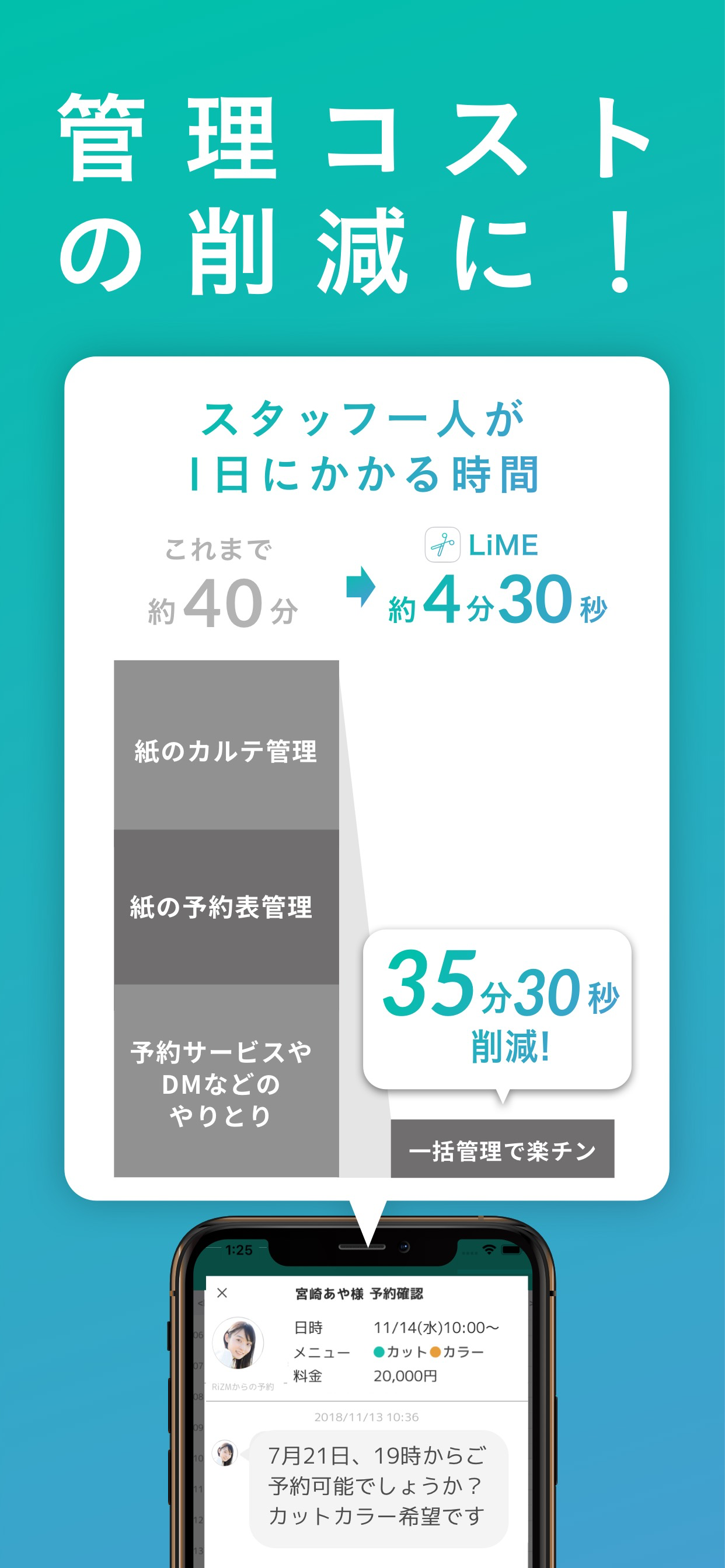 LiMEスタッフさんのサポートも申し分なく、いろいろと相談しても、迅速に対応していだけています! LINEと連携して使えるので、お客様も手間がなく、サロン側も、LINE登録もしてもらえるので、一石二鳥な感じです。私はアイラッシュサロンとして利用していて、美容室以外でも使えるのがありがたいです。いろんな機能が追加されたり、使いやすさがどんどん向上してるので、これからも楽しみにしています^^