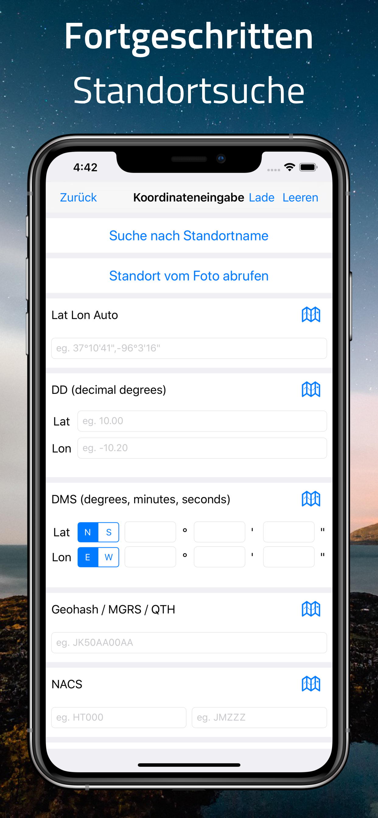Suchen Sie Ihren eigenen Standort oder geben Sie Latitude oder Längengrad ein. Und manuell einstellen Datum, Zeit und Zeitzone, wenn nötig.