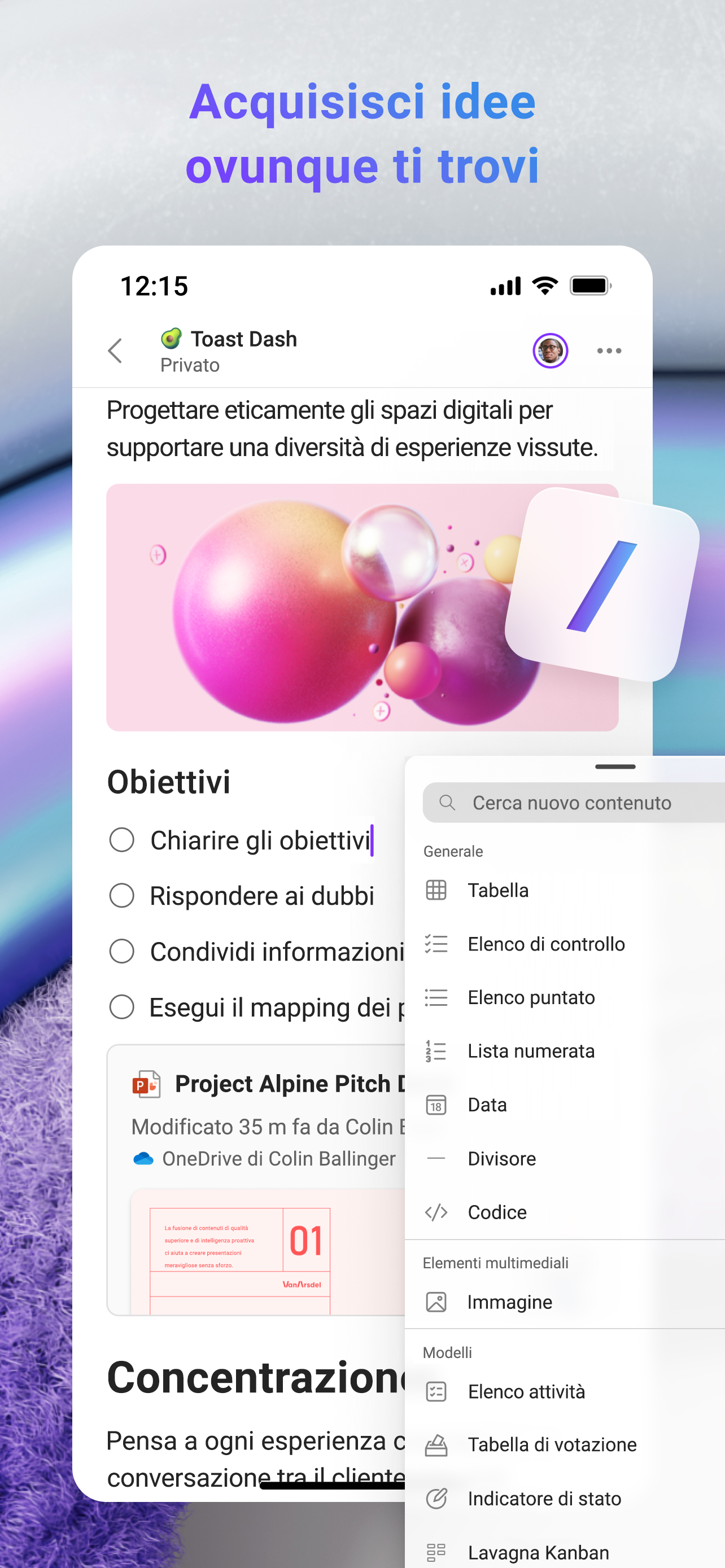 • Acquisisci idee, crea elenchi attività e inserisci foto nelle pagine Loop per esprimere le tue opinioni.