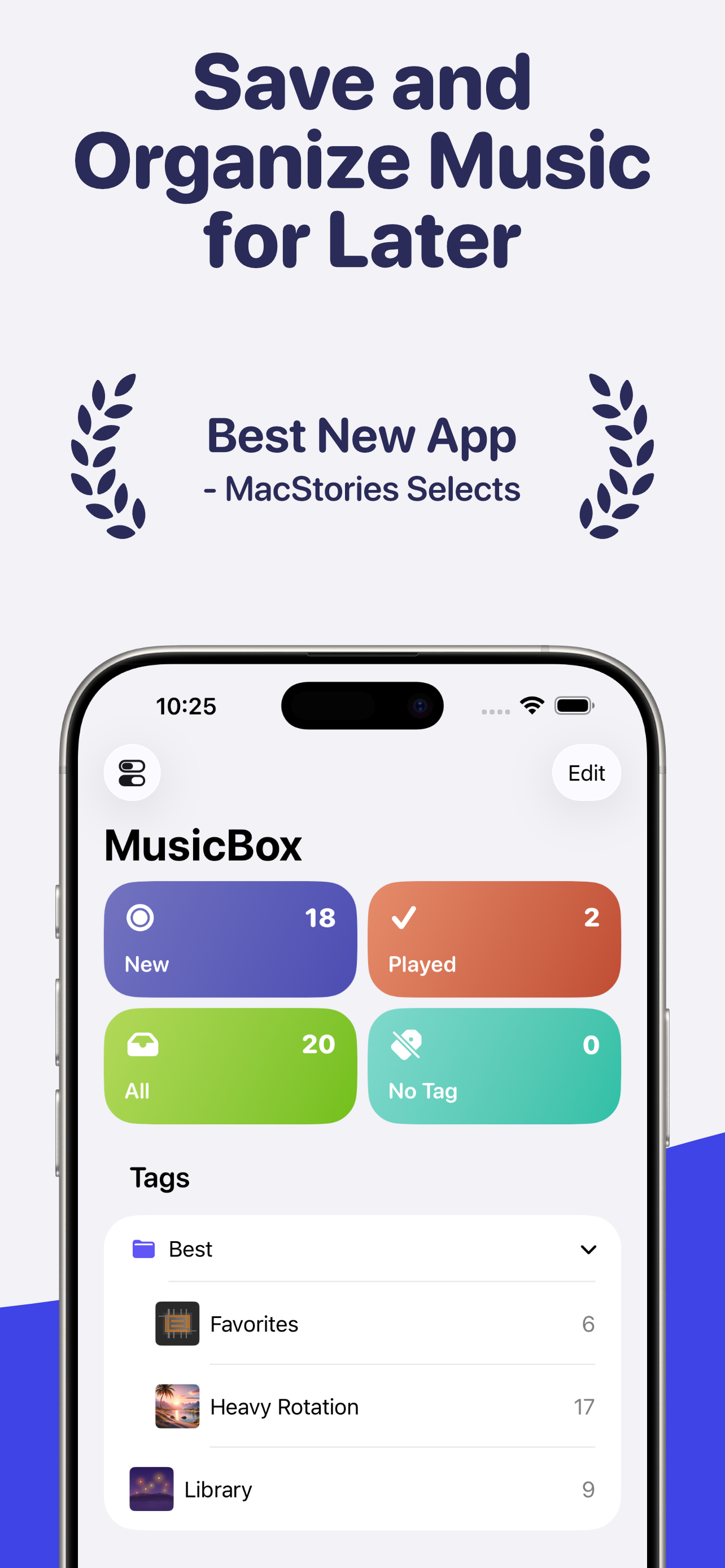 This is a super useful app, as it allows me to “bookmark” things I want to come back to, without cluttering up my Apple Music library. My only criticism is that I really wish there was an option to toggle/hide the 4 large default panels at the top of the Start Screen (if there’s a way to do this, it’s not obvious) - I interact with MusicBox entirely using Tags and Smart Searches, and those 4 default buttons are just useless clutter for me.