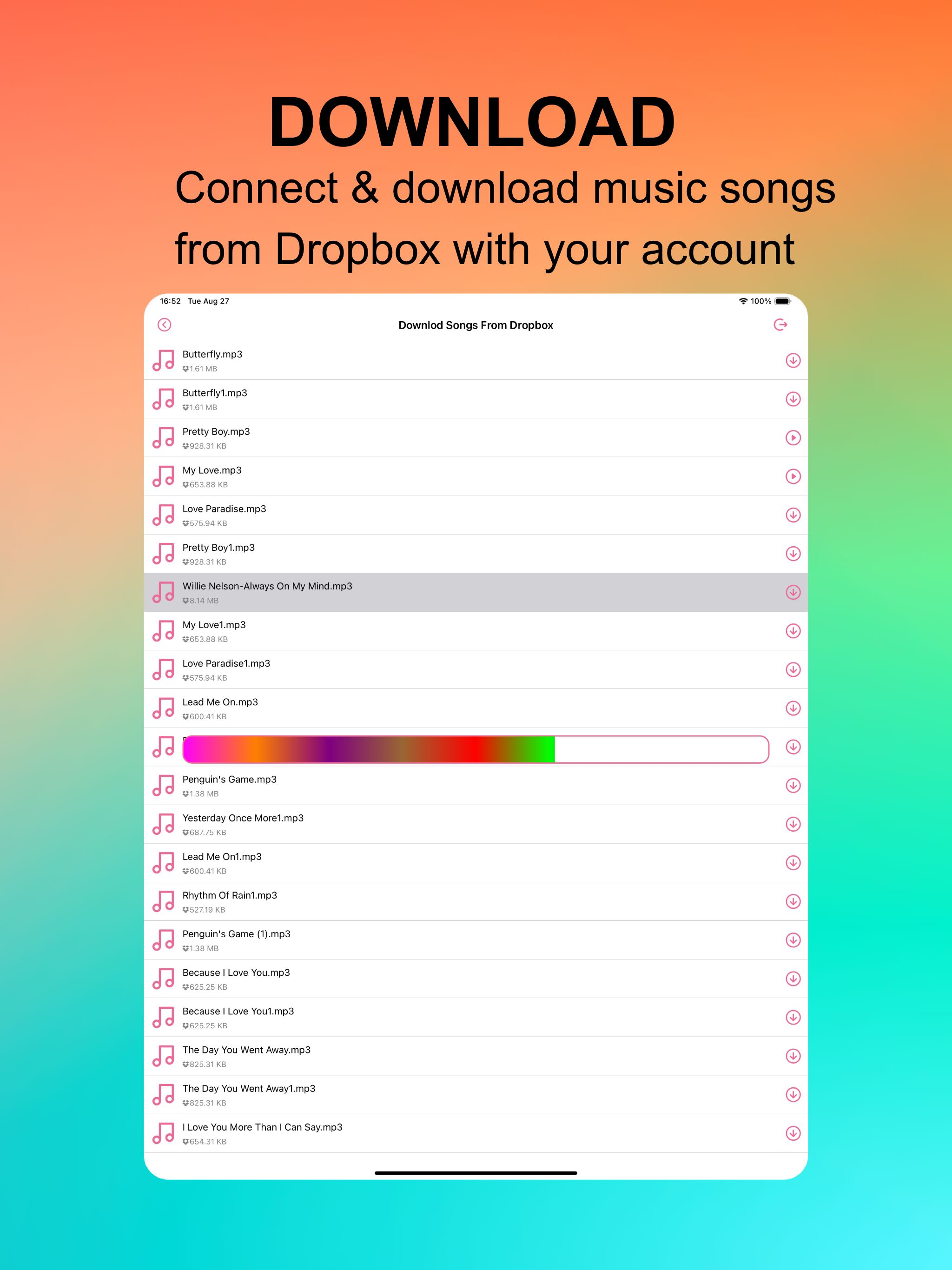 Allow you to download songs from your storages, support PC, Files App, Dropbox®.