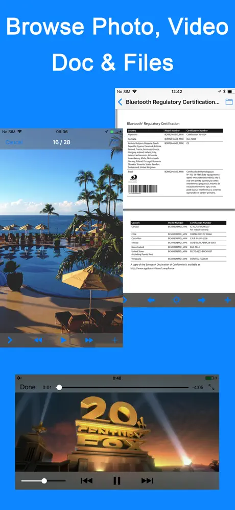 • With it, you can store and view PDF, Text(can be created and edited), PowerPoint, Word, Excel, Html, Pages, Key, Numbers and play music very simply!