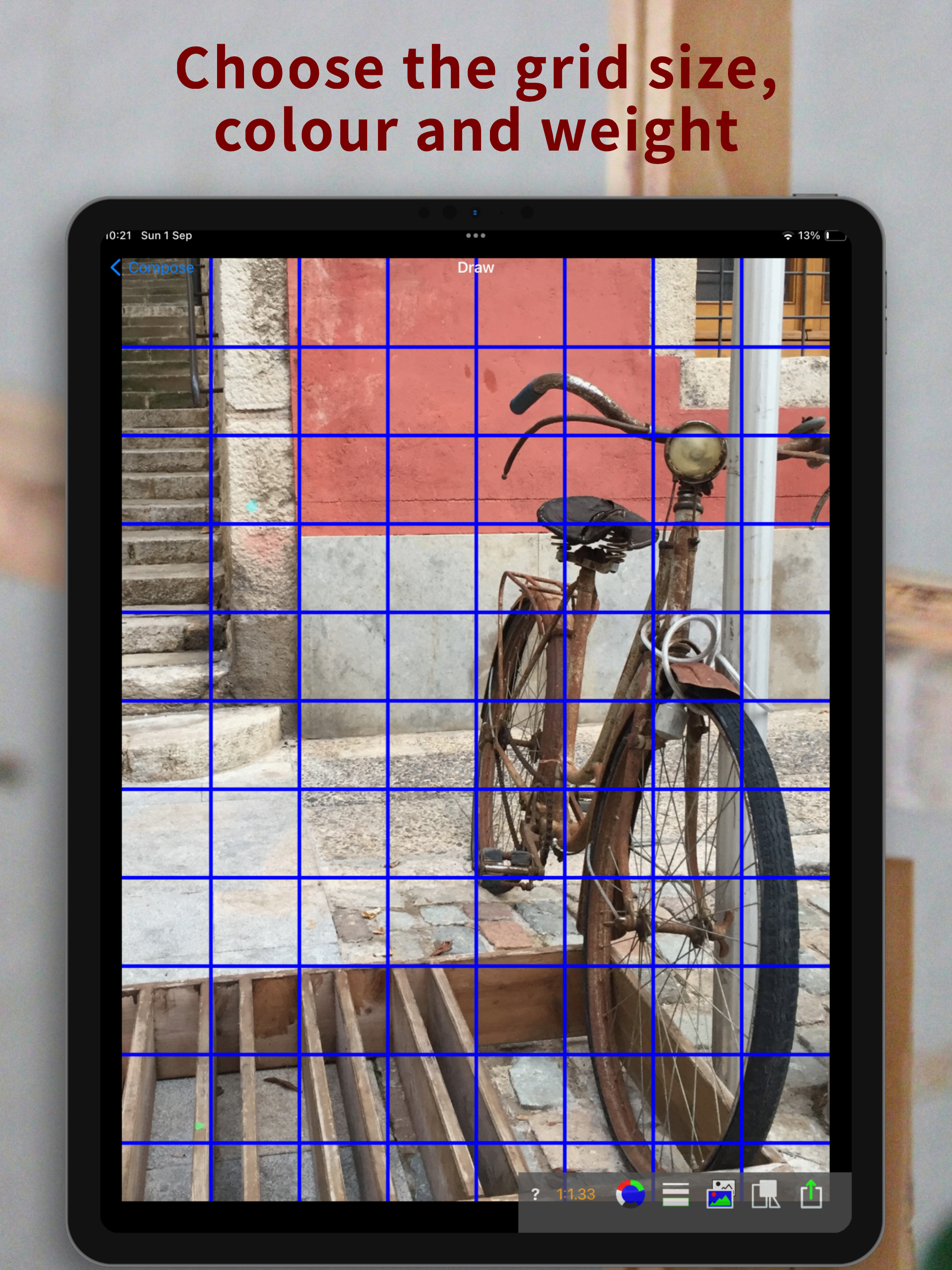 The grid is heavy and can’t be lightened. The picture with grid cannot be saved or exported. Until the functionality of this app is updated I’ll be looking elsewhere.